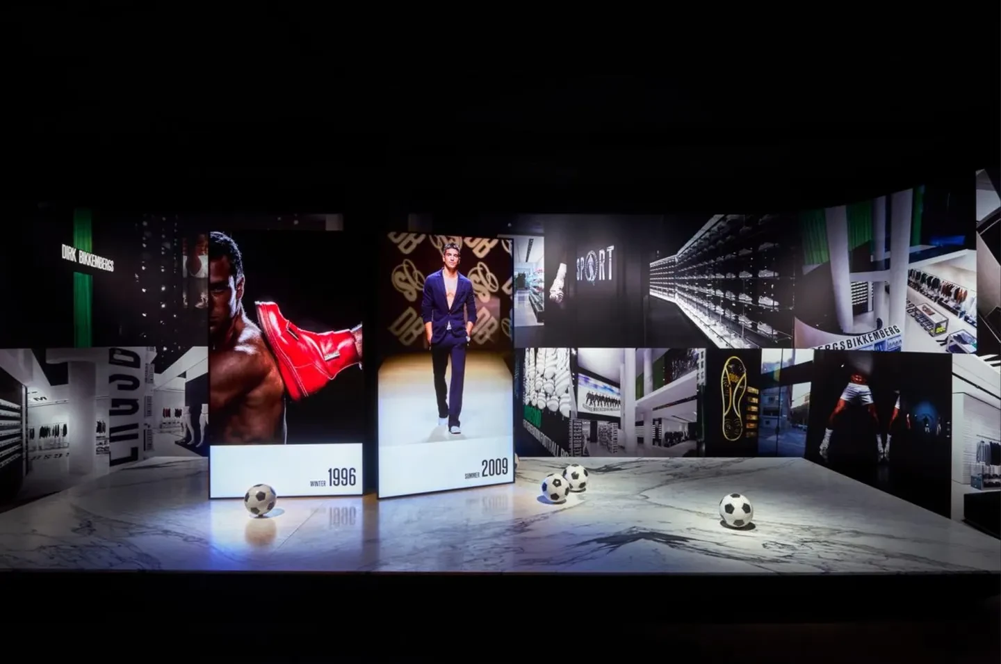 Bikkembergsova prezentace je bez oblečení a převážně digitální, ukazující jeho atletickou estetiku prostřednictvím silně nasycených obrazů jeho oblečení na jeho oblíbených modelech na dvou velkých obrazovkách, naproti nimž běží obrázky z jeho milánské vlajkové prodejny – atletova „bachelor pad“, tedy jeho moderního bytu, s Porsche a okázalým uměním.
