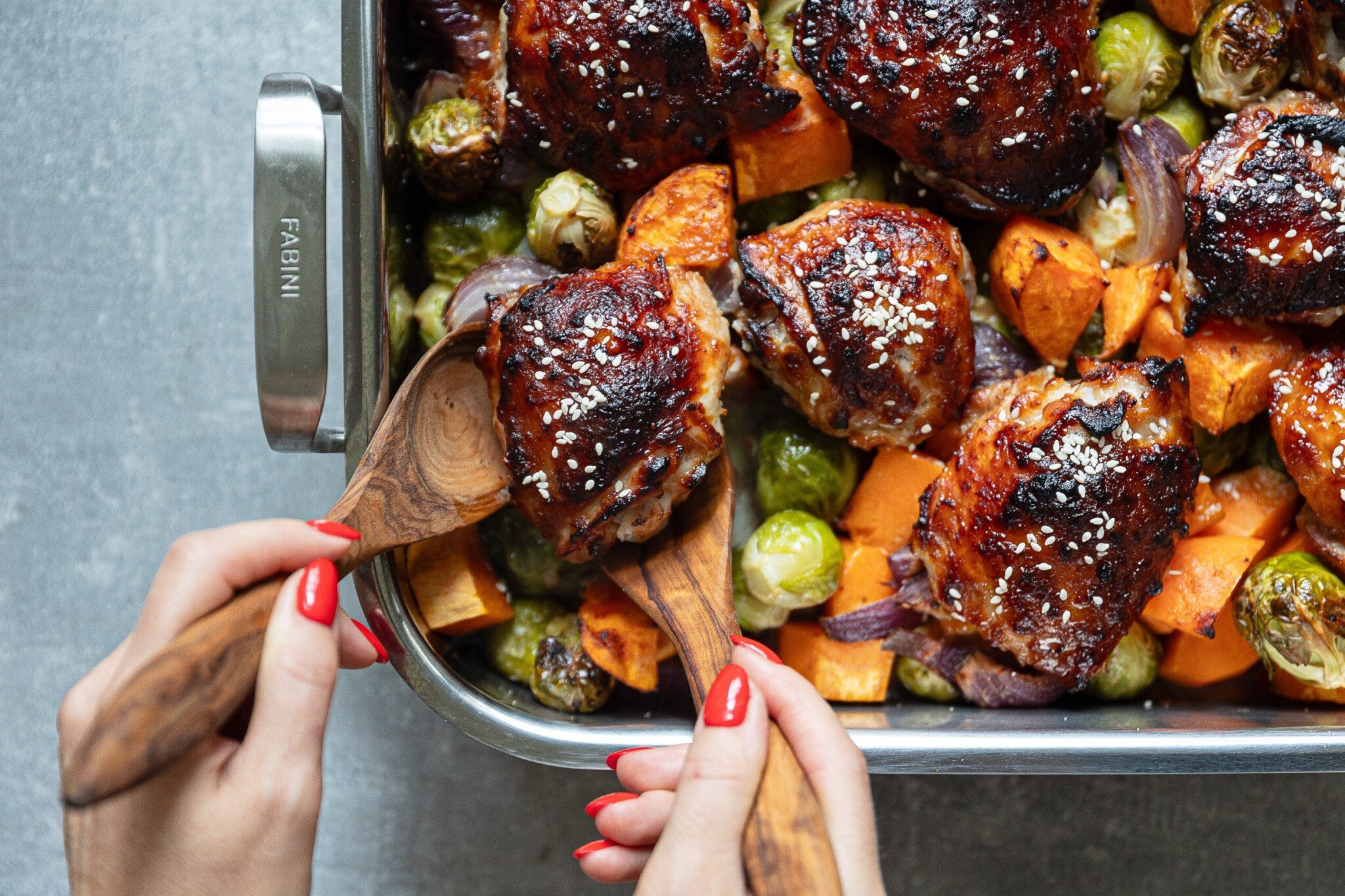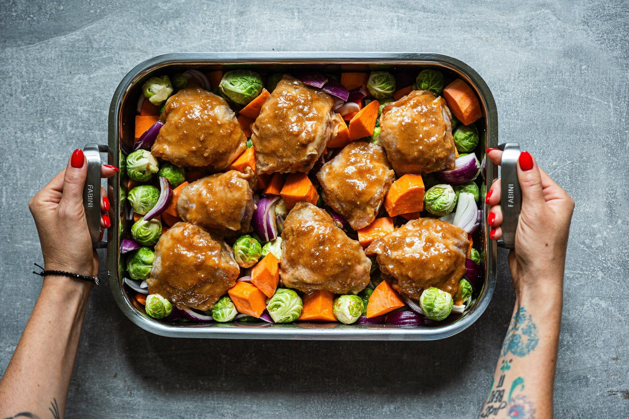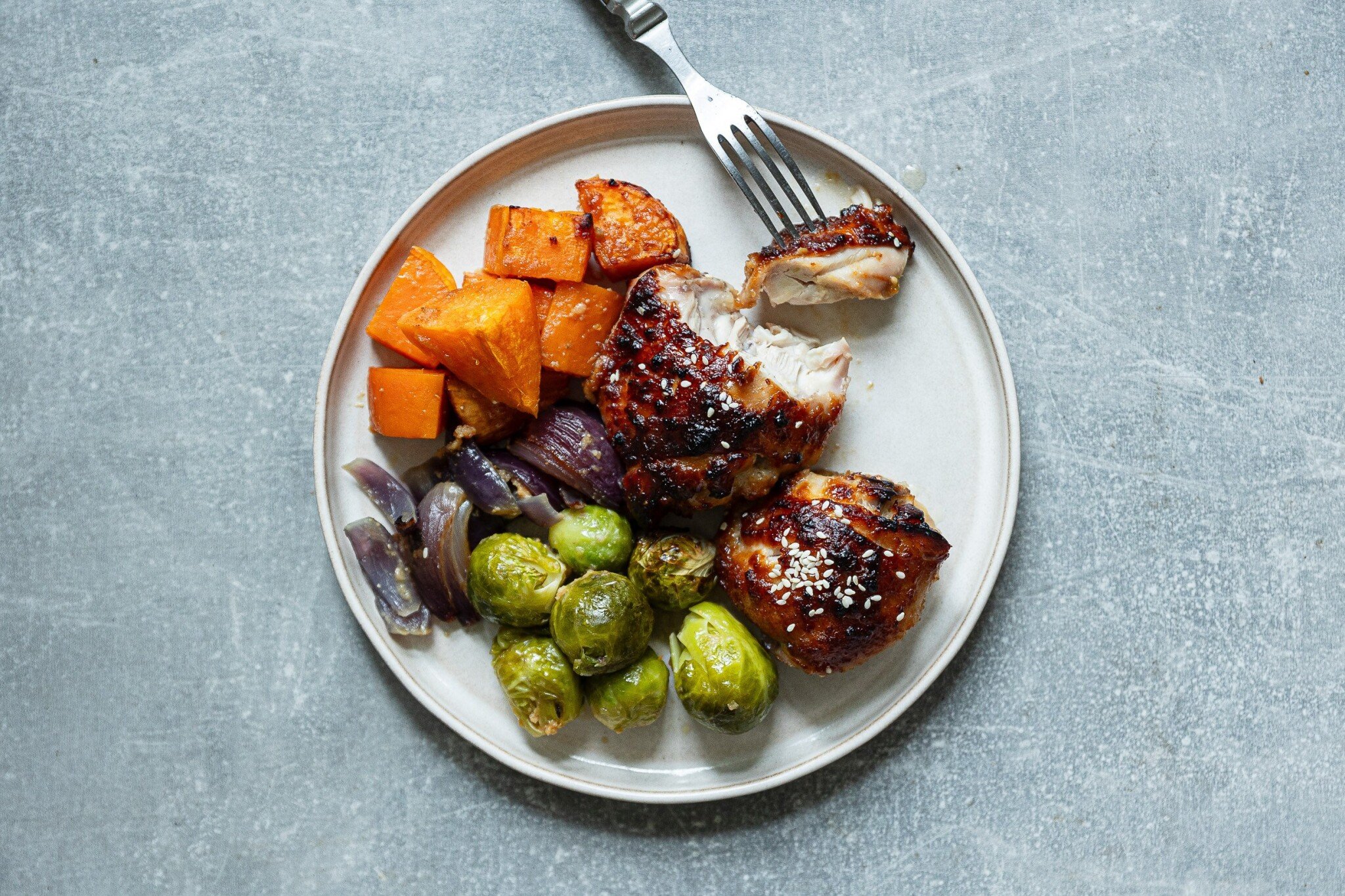 Pečené kuře se zeleninou (sladkými brambory, růžičkovou kapustou a cibulí) na medu a česneku