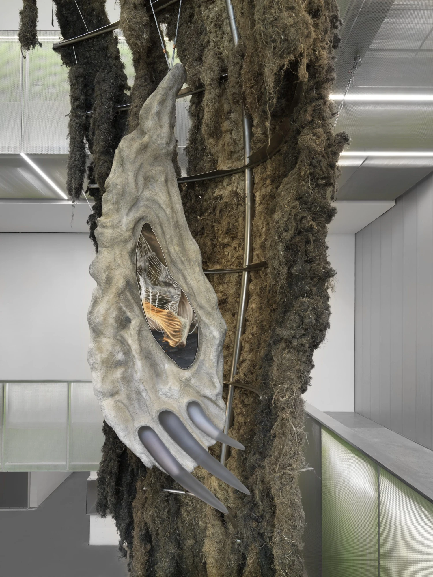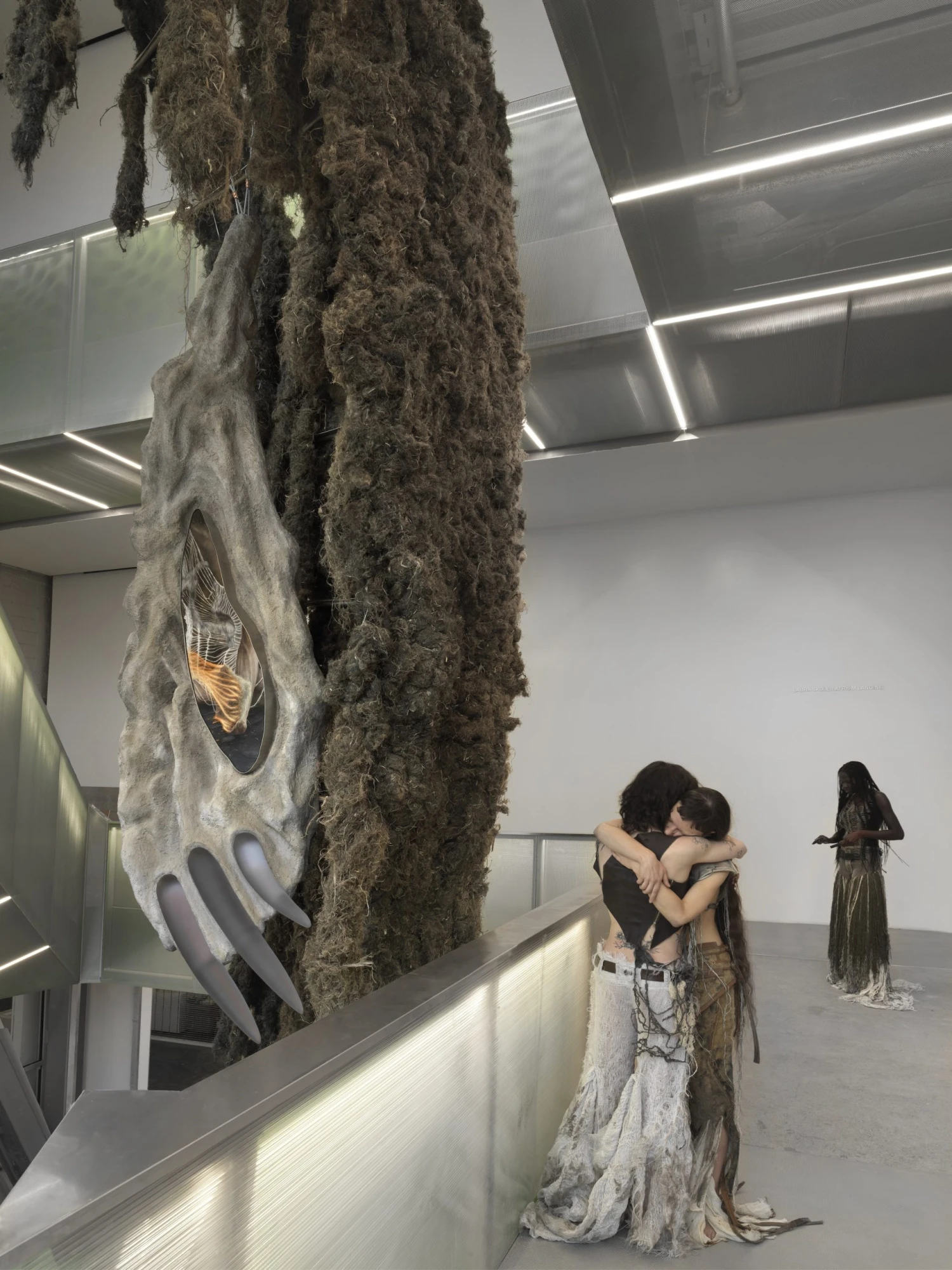 I nová práce Kláry Hosnedlové odráží její zájem o otázky práce, genderu a historické paměti. Její monumentální socha z pískovce a skla je obklopena útvarem připomínajícím kožešinu. Vytvořen je z textilie na bázi lnu. A jak je zvykem, nese autorčiny typické detailně propracované výšivky.