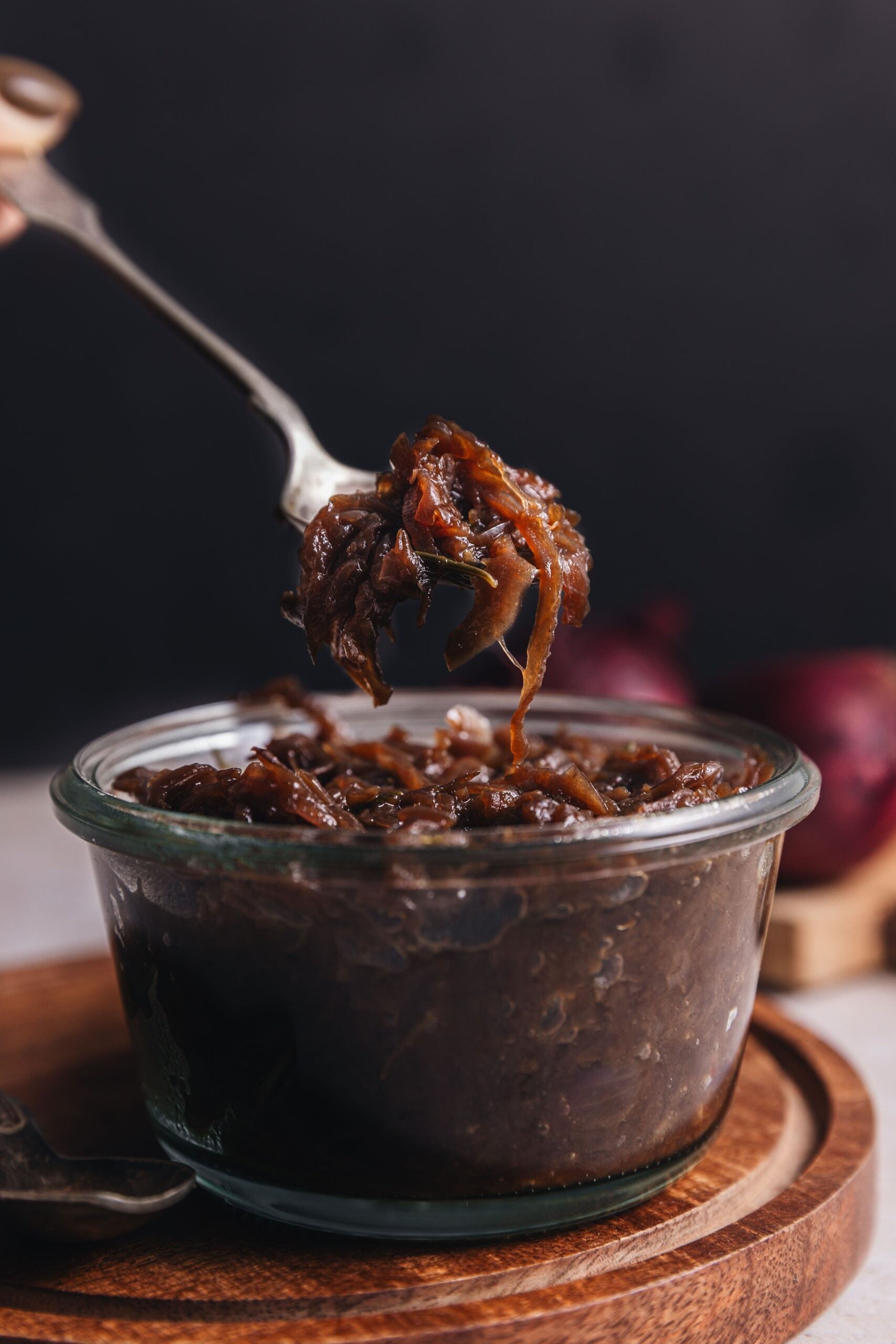 Cibulové chutney z červené cibule je sladkokyselý kondiment, který vzniká pomalým vařením červené cibule s octem, cukrem a kořením do husté, lesklé konzistence. Hodí se k masu na grilu i v troubě, ke zrajícím i čerstvým sýrům, do burgerů místo klasické omáčky a na sýrové prkénko jako poctivá náhrada za marmeládu. Vydrží v lednici několik týdnů, pokud ho tedy nesníte dřív, což je pravděpodobnější. Můžete ho ale i zavařit, tak vydrží i několik měsíců.