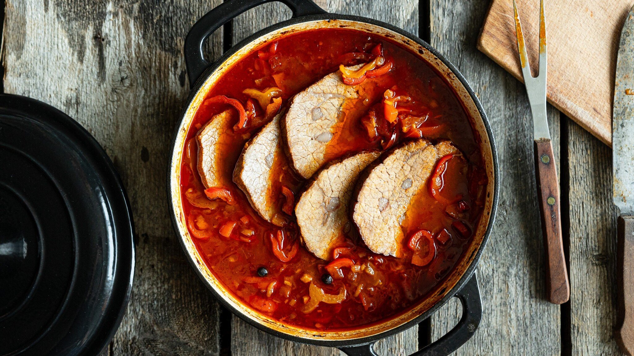 - Před uplynutím posledních 45 minut rozložte okolo masa zbylou papriku a pokračujte v pečení. Na posledních 15 minut pánev odkryjte a nechte povrch masa lehce zezlátnout.