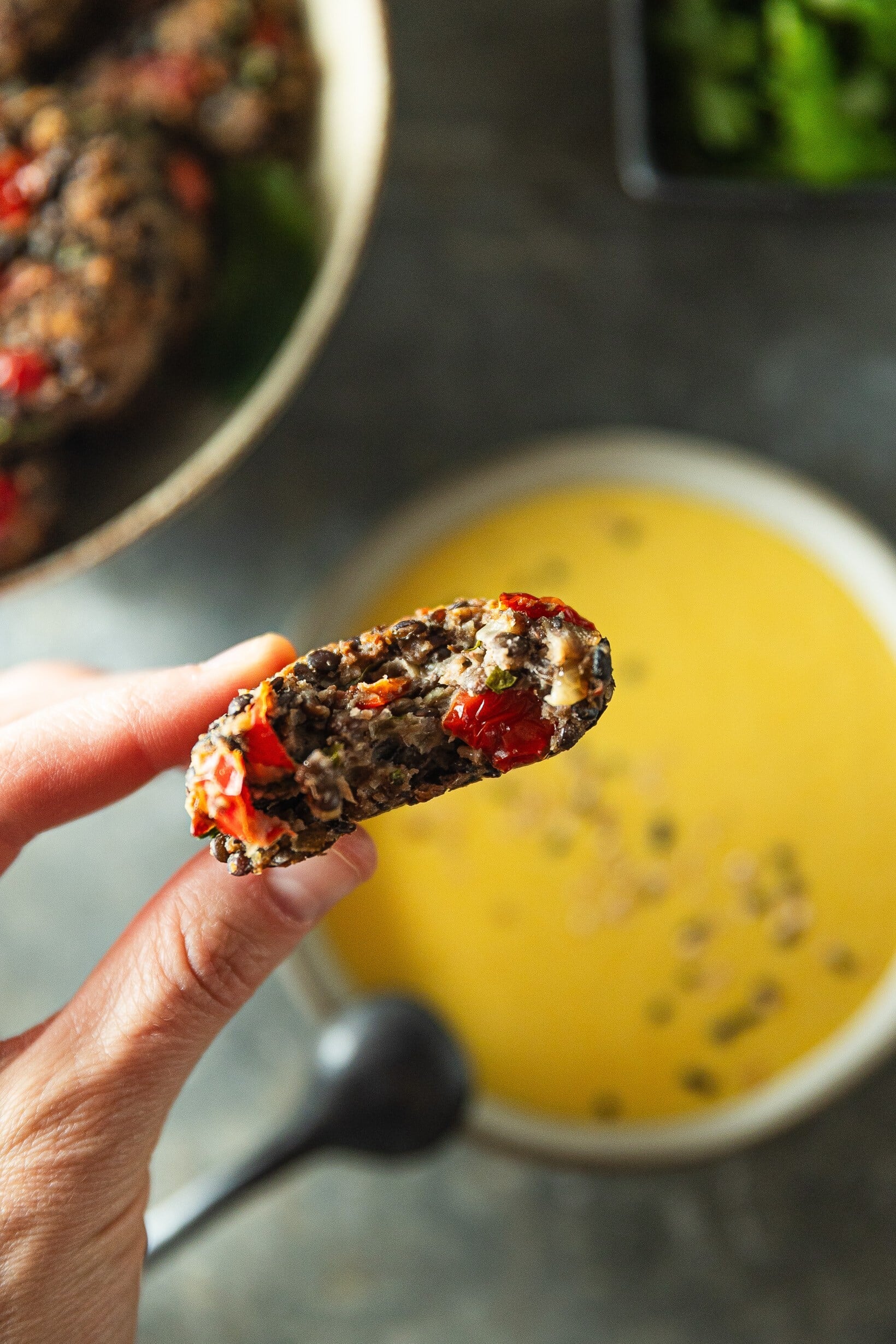 Čočkové karbanátky s kurkumovou tahini omáčkou