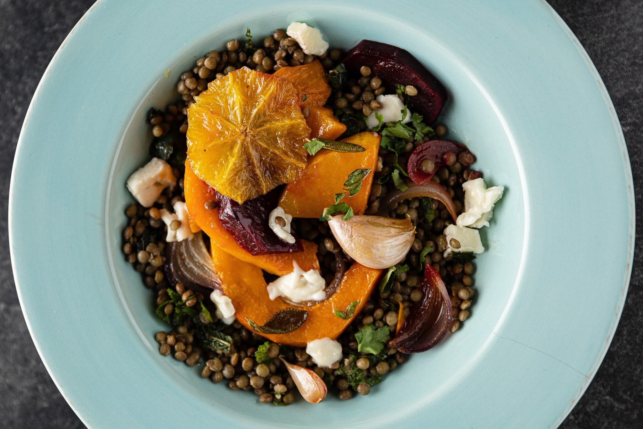Čočka puy s pečenou zeleninou, gorgonzolou a kari dipem