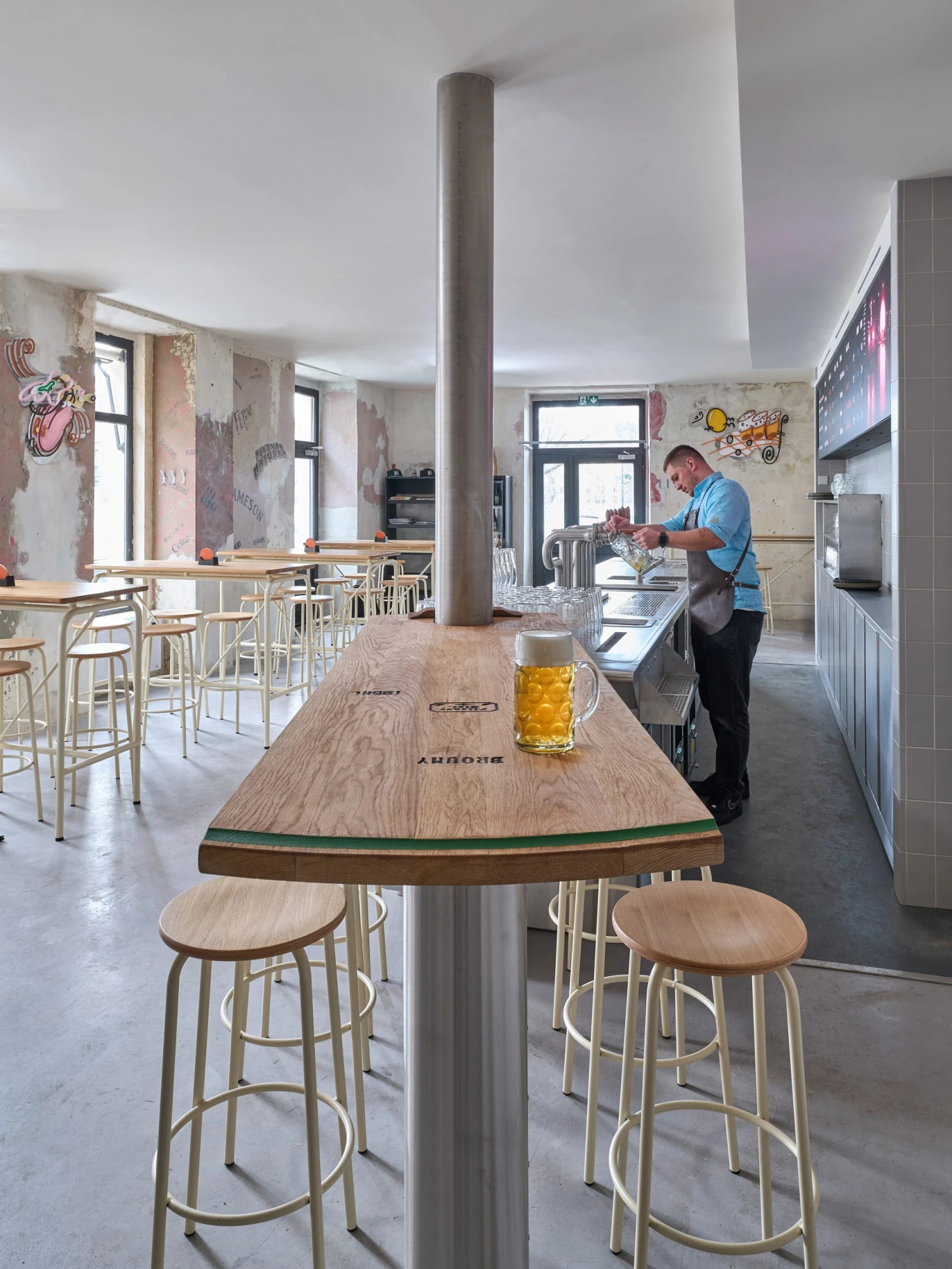 Stůl není ukrytý někde v rohu, ale je téměř součástí výčepu. Přímo na něj totiž navazuje. „Je vyrobený z čela sudu z plzeňského Prazdroje o objemu 275 hektolitrů. Dělali ho tamější bednáři, kterých si hluboce vážím. Tloušťka použitého dřeva je skoro osm centimetrů, takže doufám, že nás jednou přežije,“ říká minipivovarník a dnes už šéf gastronomické miniskupiny s ambicí růst.