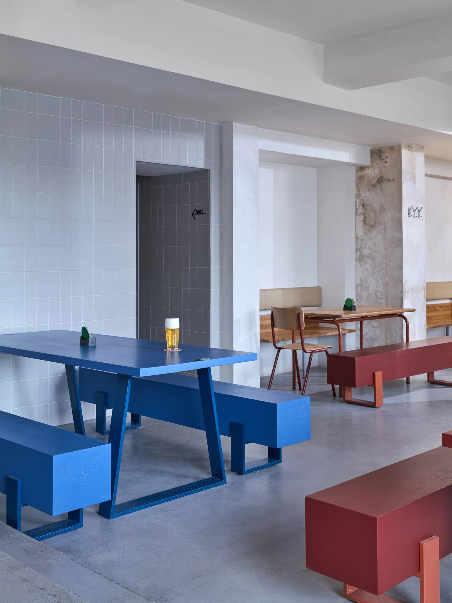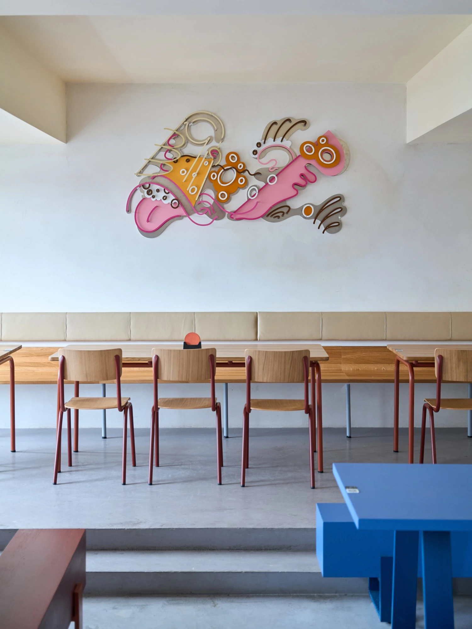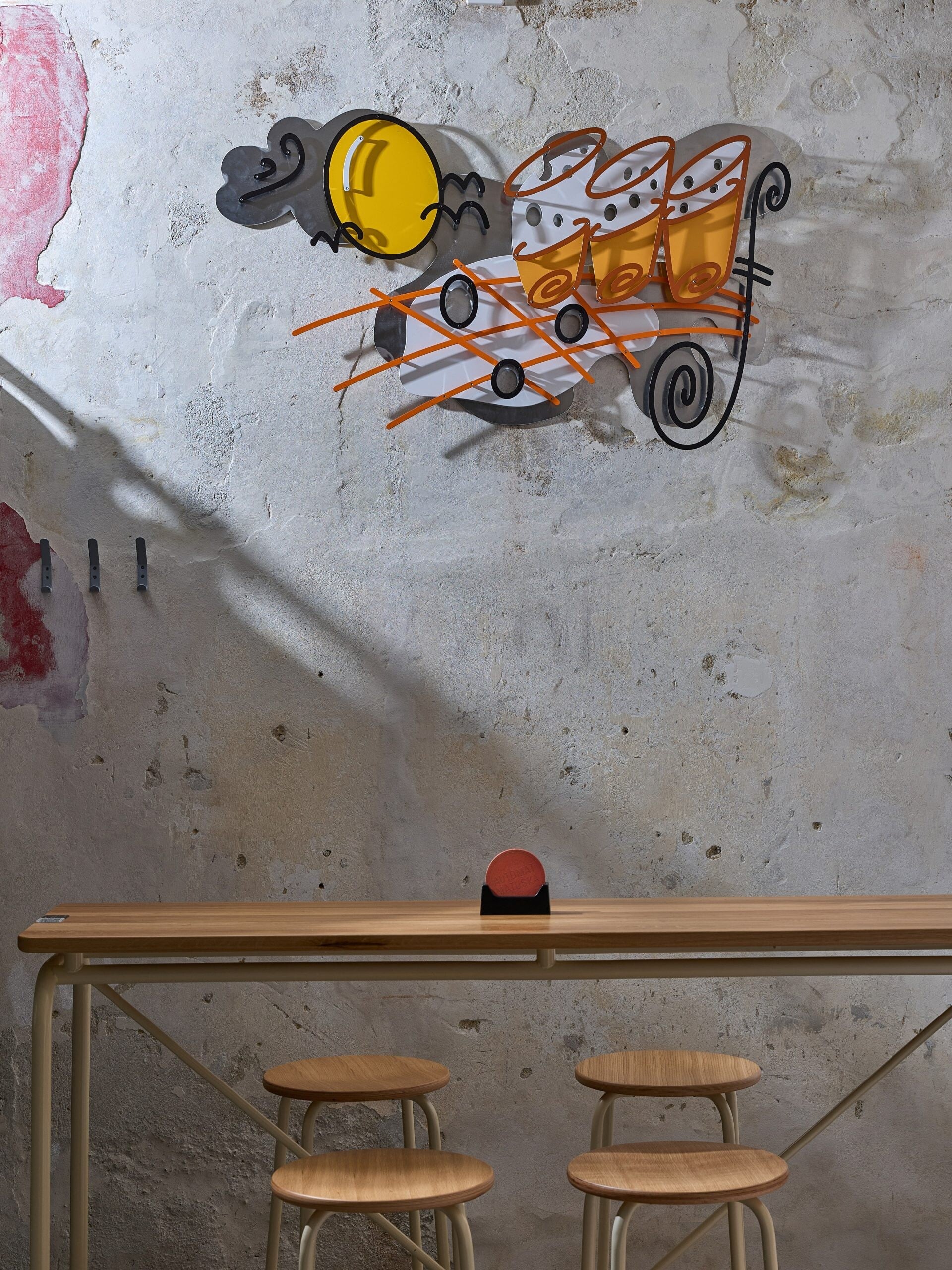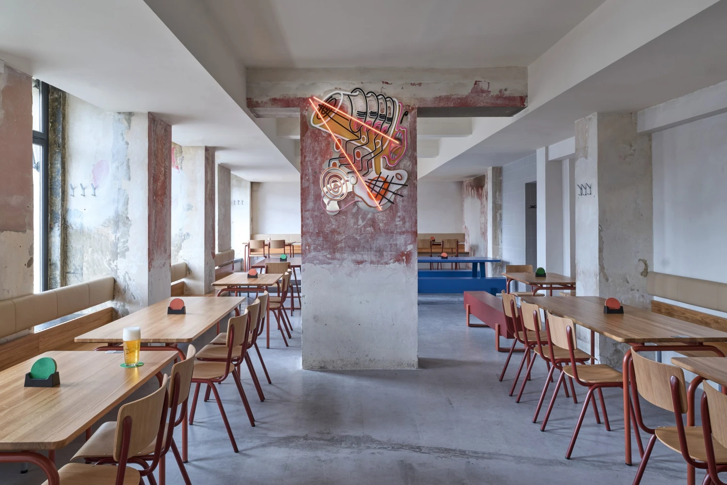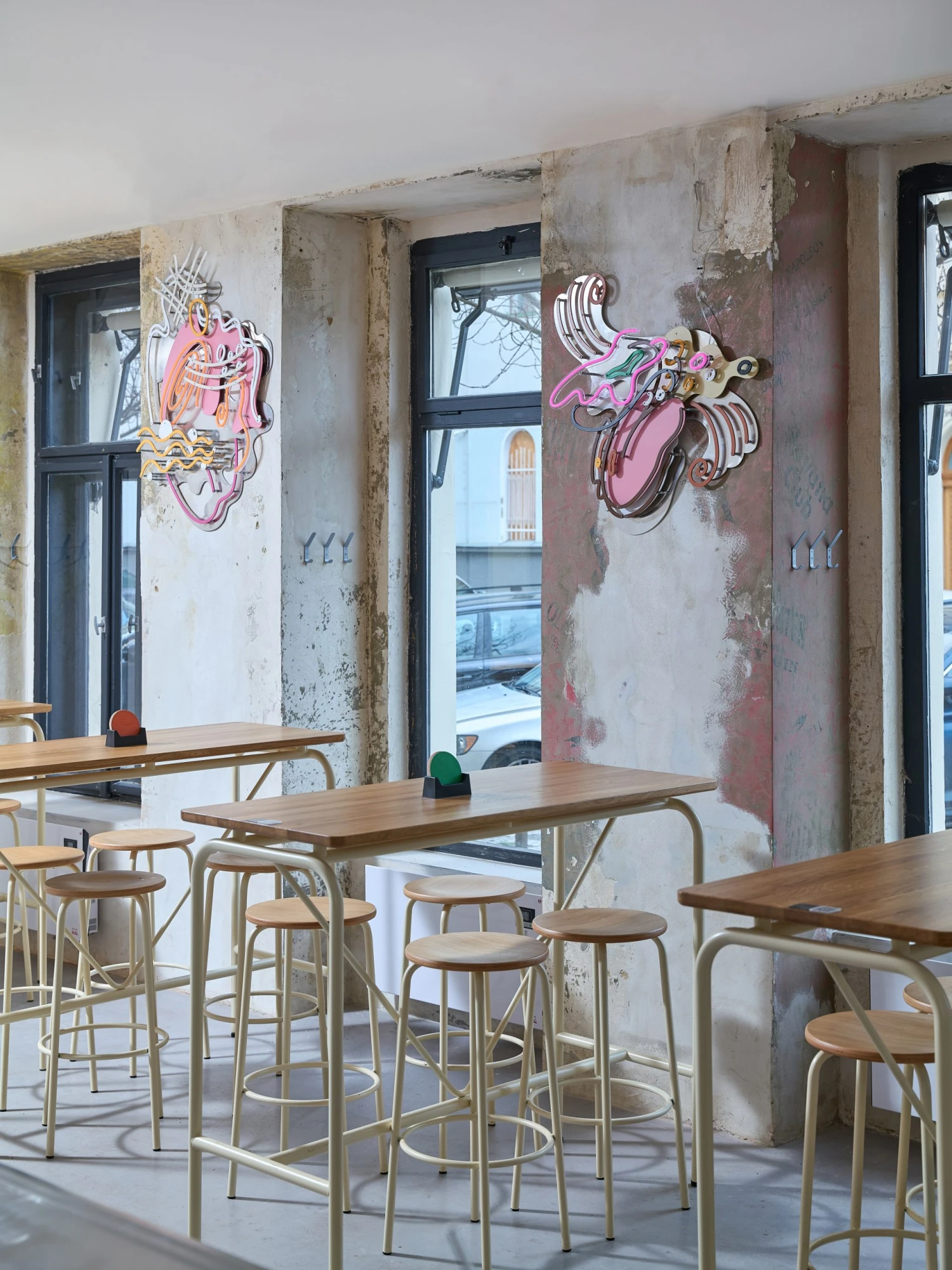 Oproti Hradčanské zažijí o něco útulnější interiér, kde ale nechybí ani mladistvý punk. Třeba ve formě některých stěn, které po oškrábání zůstaly nevymalované. Co zůstalo, je Adamova spolupráce s bratrem a výtvarníkem Jakubem Matuškou, který na umělecké scéně vystupuje pod jménem Masker. Jeho díla v podobě světelných instalací zdobí stěny podniku, díky kresbám jsou pak zábavnější dámské i pánské toalety.
