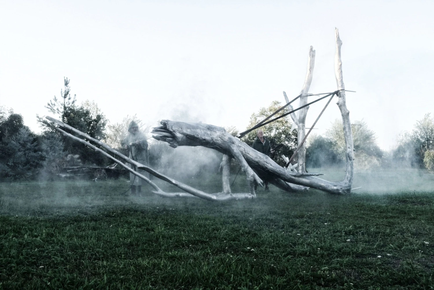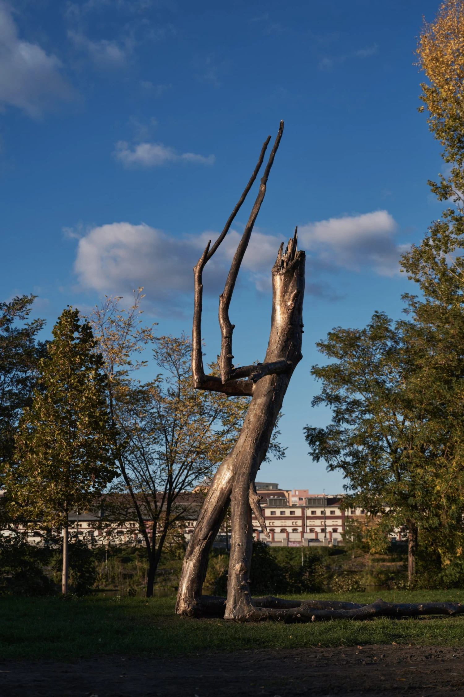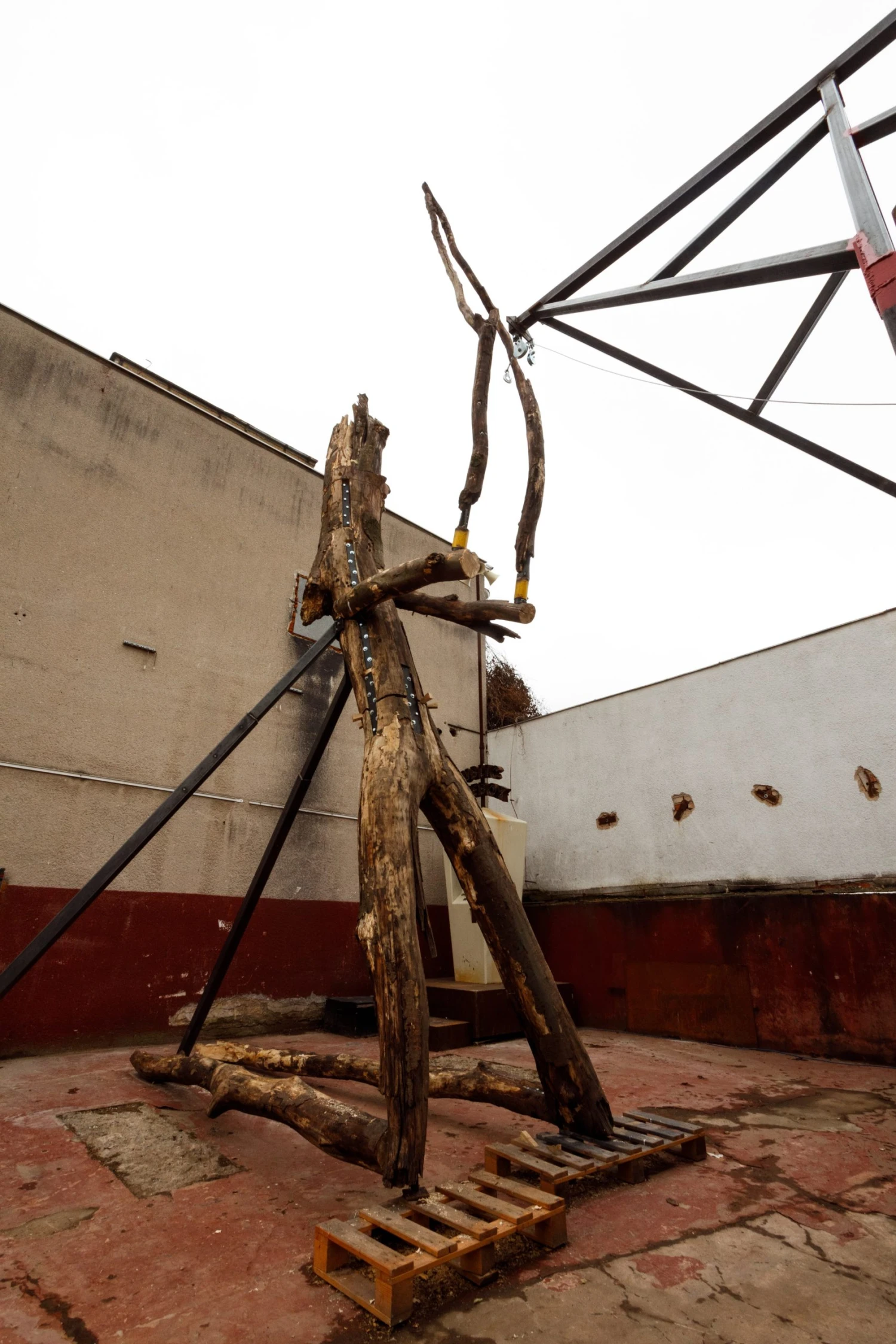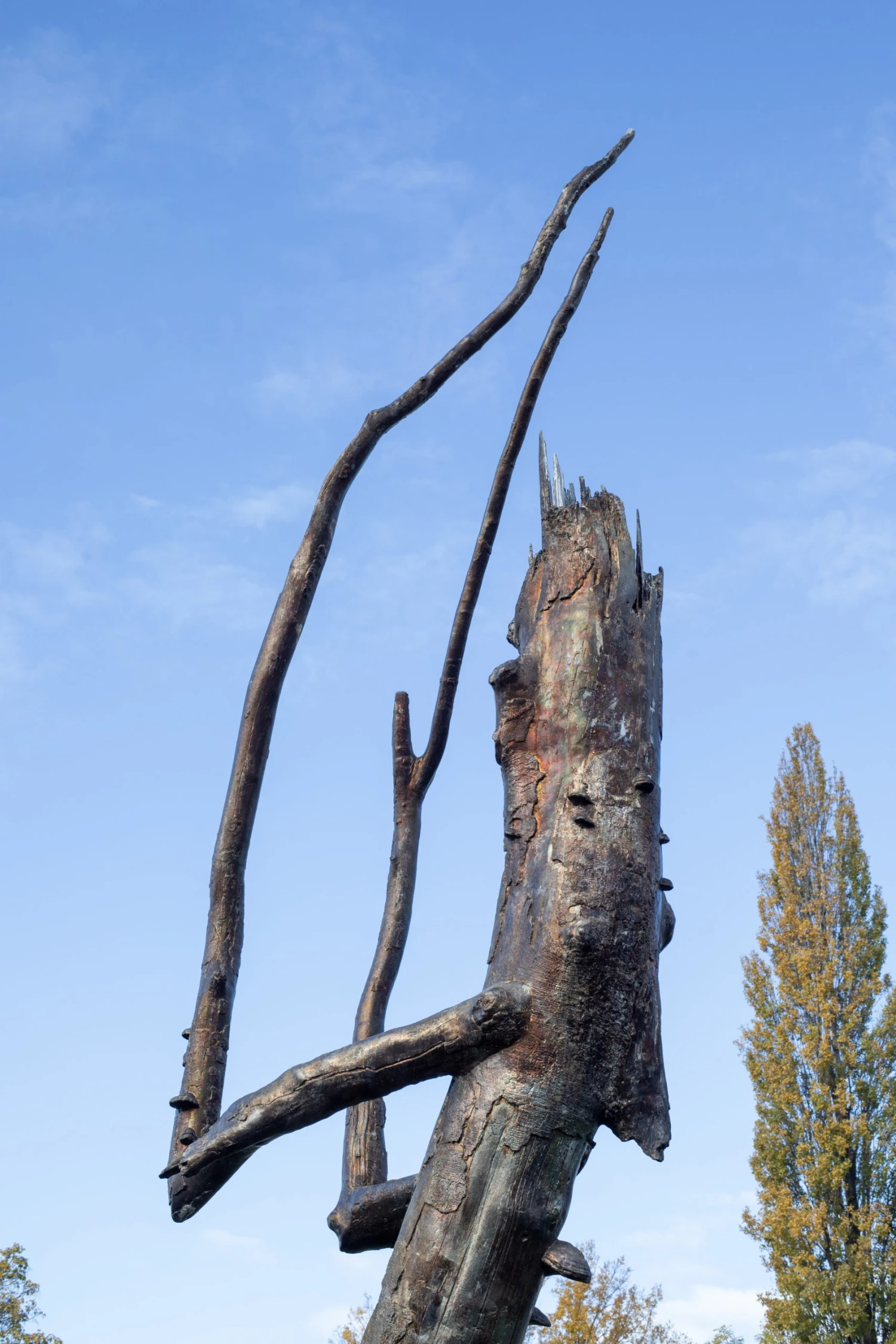 „Chtěl jsem, aby socha působila jako zjevení a aby na první pohled nebylo poznat, z čeho je vyrobená,“ říká Krištof Kintera u svého díla tvarem připomínající obří dřevěný samorost, antropomorfní strom. „Nepoznají to ani lidé z oboru. Když jsem měl sochu v ateliéru, mnozí z nich mi říkali: Je to skvělé, ale nebojíš se, že ti to tu shnije?“ dodává.
