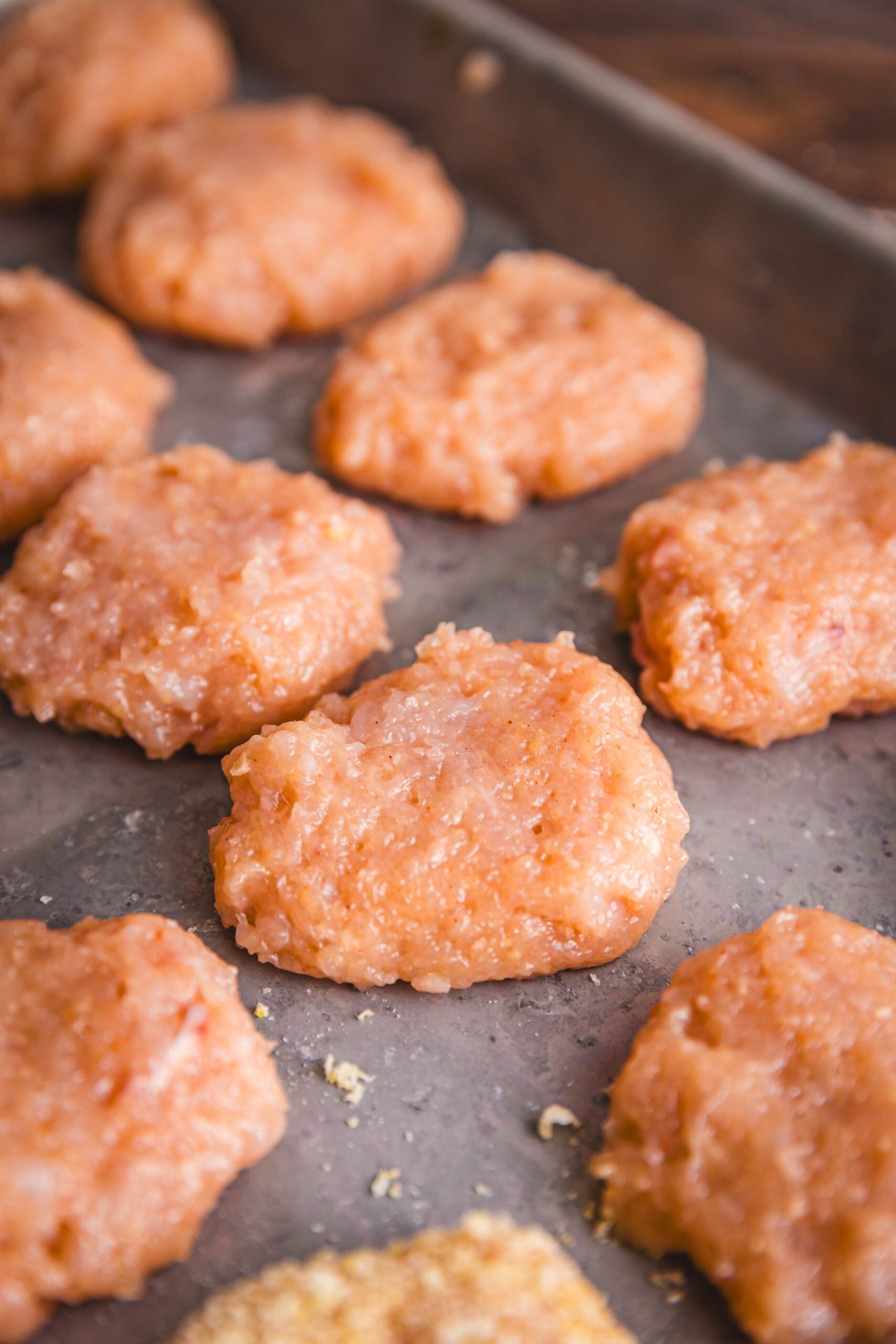 - Kuřecí prsa očistěte a přesuňte do mixéru spolu s kořením, solí a pepřem. Pár pulzy rozmixujte na malé kousky, následně přidejte vajíčko a škrob a opět pár pulzy rozmixujte do hladké směsi.