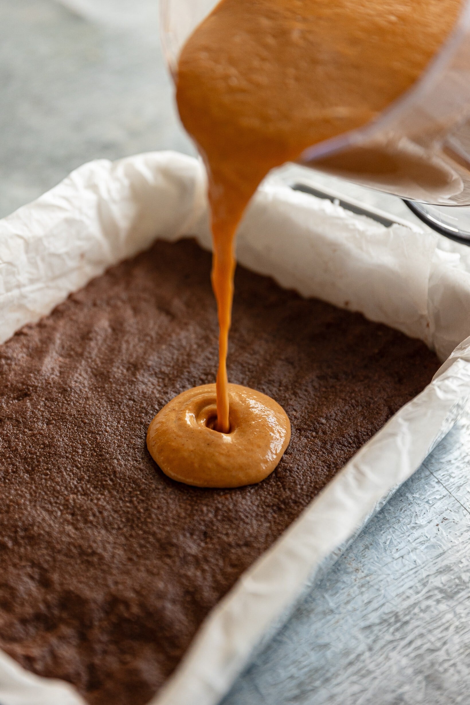 - Těsto spojte dohromady a rovnoměrně upěchujte na dno formy o velikosti cca 22 × 30 cm, vyložené pečicím papírem. Vložte do trouby vyhřáté na 175 °C a pečte přibližně 12 minut do zezlátnutí. Vyjměte z trouby a nechte zatím zchladnout na mřížce.