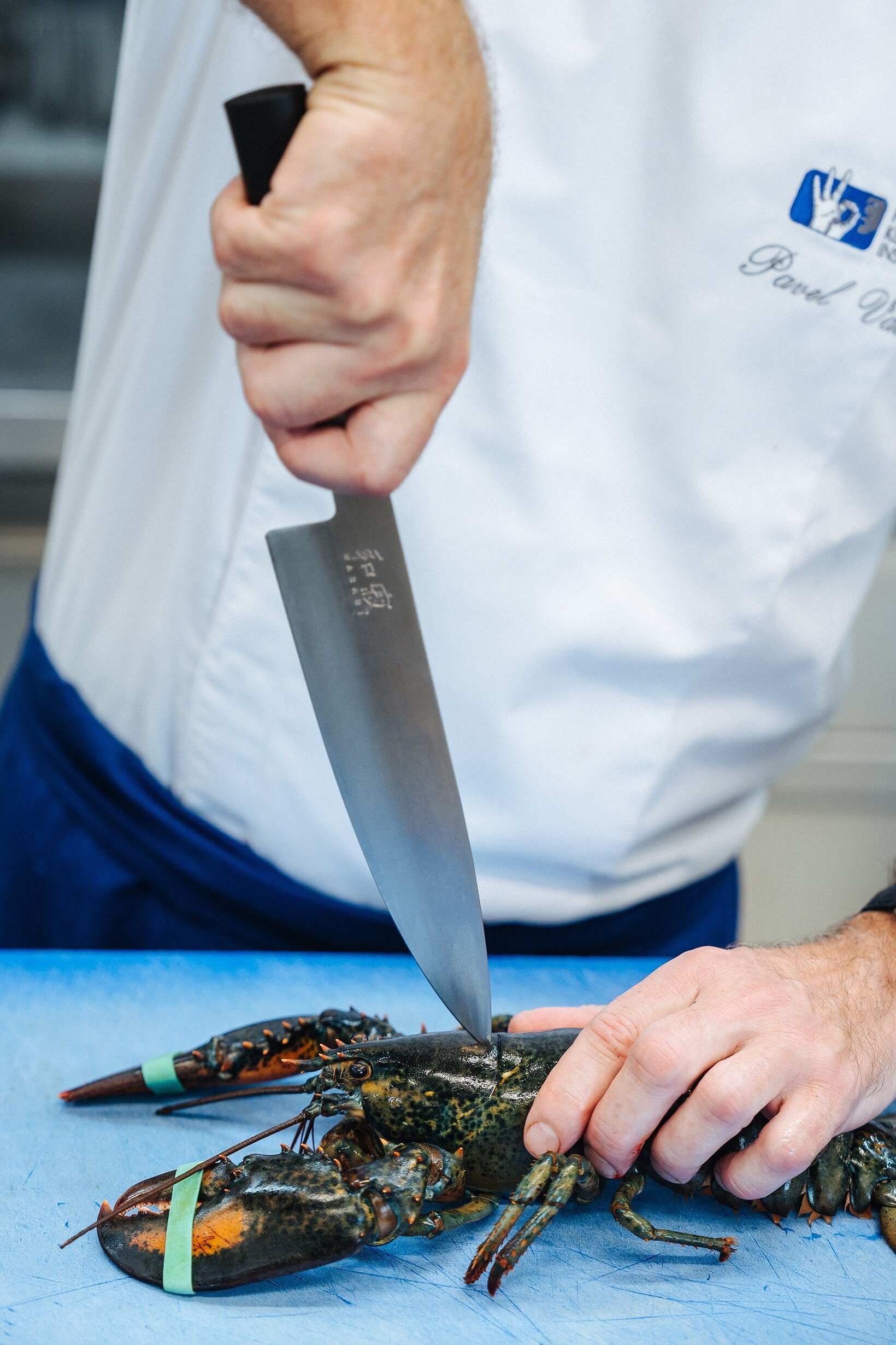 - Servírování: Máslo nechte zpěnit do hněda, vypněte, maso z humra na něm pouze prohřejte, lehce osolte a opepřete. Maso umístěte doprostřed talíře a zalijte vymixovanou polévkou. Přidat můžete máslo z opékání humra a krutony z bílého pečiva. Pavel je opéká na másle, ve kterém nejdříve nechal rozvonět česnek.