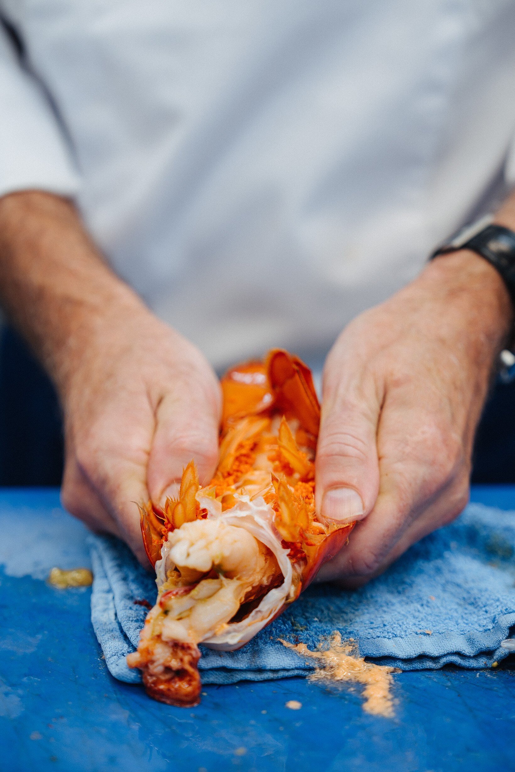 - Humr & vývar: Humra uvaříte i jen v osolené vodě, ale s kořením a zeleninou bude lepší. Zeleninu (množství je spíše orientační) nakrájejte na větší kusy, dejte do hrnce s vodou a na vysokém ohni přiveďte k varu. Vložte humra a dle velikosti vařte 4 až 5 minut. Uvařeného humra přendejte do studené vody s ledem, abyste zastavili jeho var.
