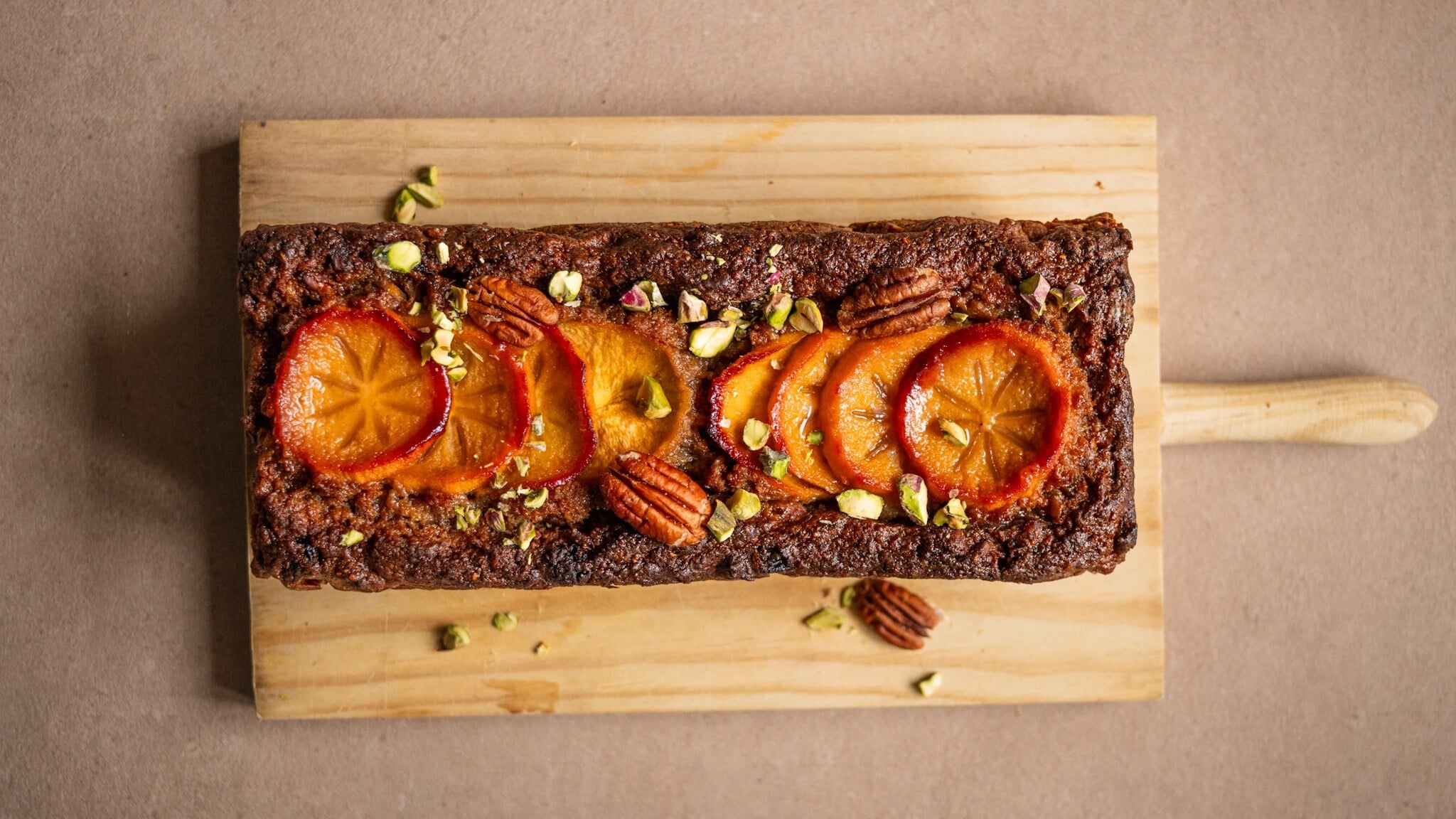 Pokud tápete, kam se sladkým kaki, proměňte toto medové zimní ovoce v bohatý dezert plný ořechů, datlí a jemného koření. Díky ovocnému pyré zůstává těsto chlebíčku dlouho vláčné a jeho chuť se druhý den ještě prohloubí. Koláč je navíc bez vážení a zužitkujete do něj jak lehce přezrálé kaki, tak zbytky ořechů a sušeného ovoce.
