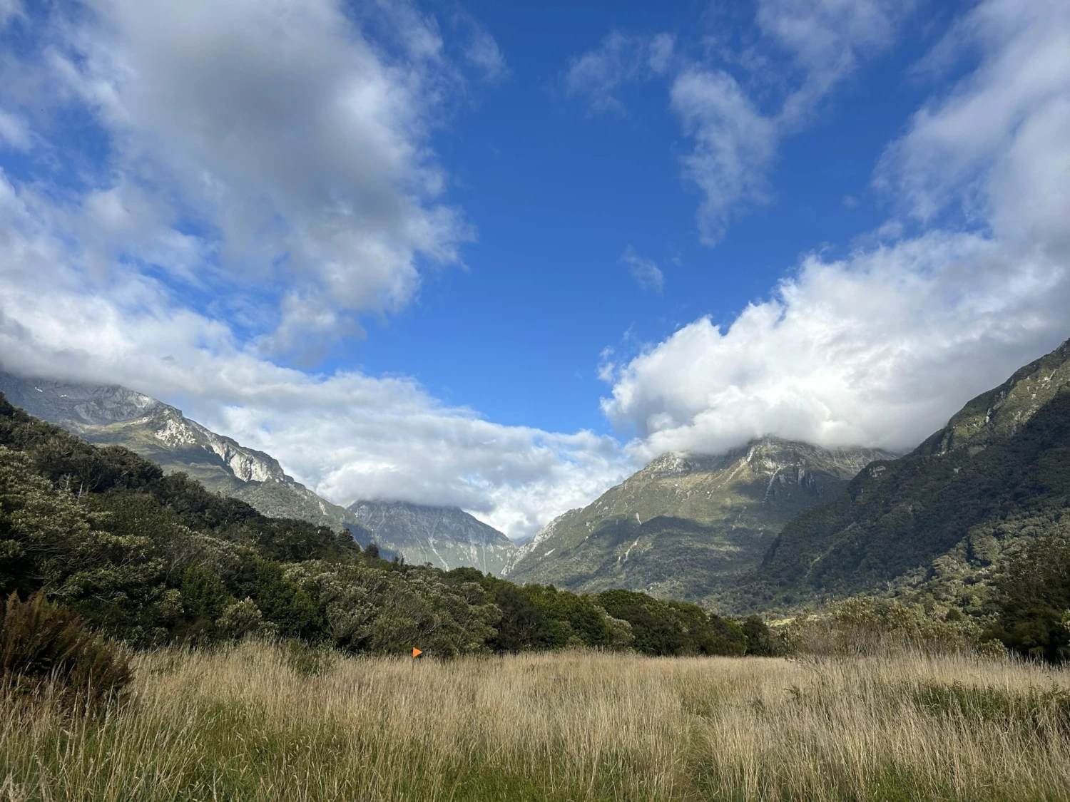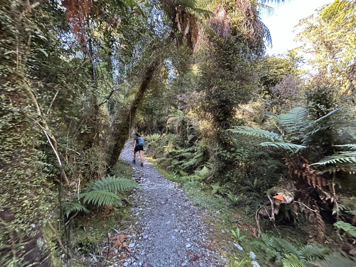 Hodně výšlapů na Novém Zélandu začíná v deštném pralese, kde rostou kapradiny s mohutnými listy a další rostliny připomínající původní pravěký kontinent. Cesty jsou značené oranžovými trojúhelníčky.