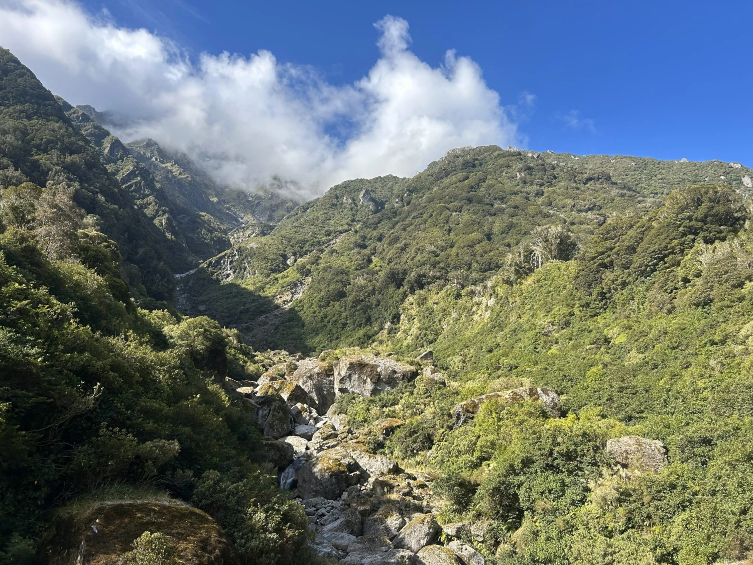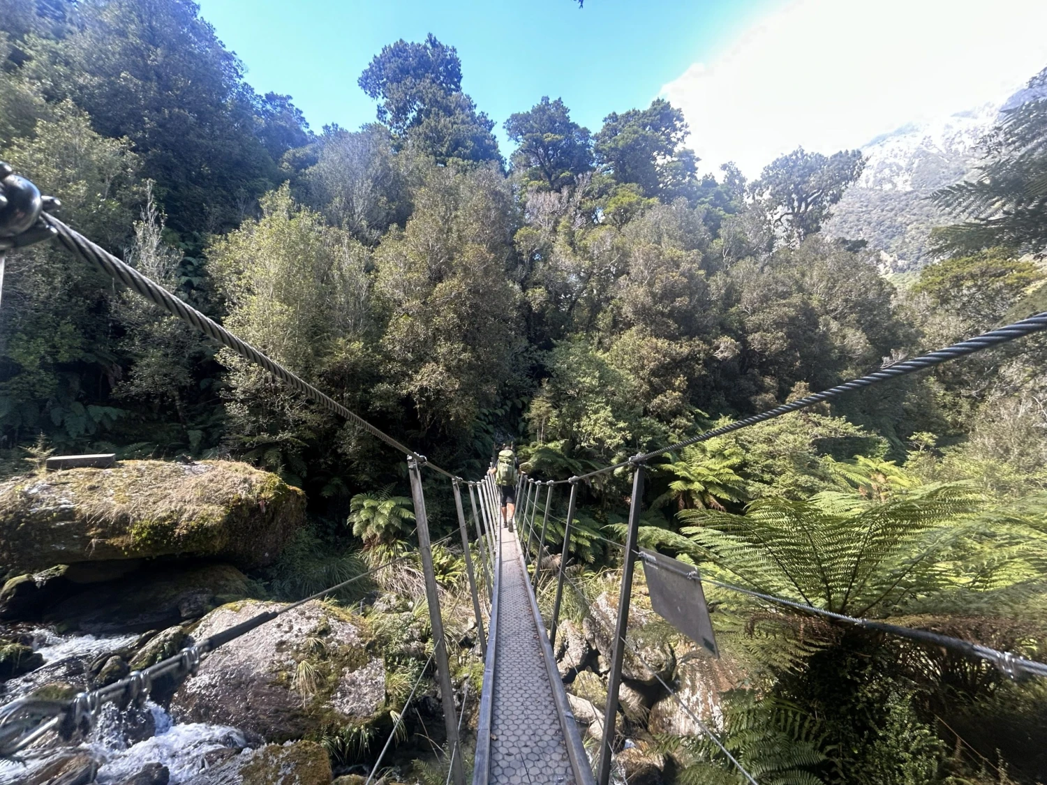 Stoupáme ledovcovou krajinou po stezce známé jako Copland Track a před námi je další z řady zdejších visutých mostů. Tento se klene opravdu hodně vysoko nad bystřinou a údolím pod ním, ale výhled na jeho konci je za odměnu. Nad námi se tyčí vrcholky Jižních Alp a někde za těmi nejbližšími je také nejvyšší novozélandská hora Mount Cook neboli Aoraki.