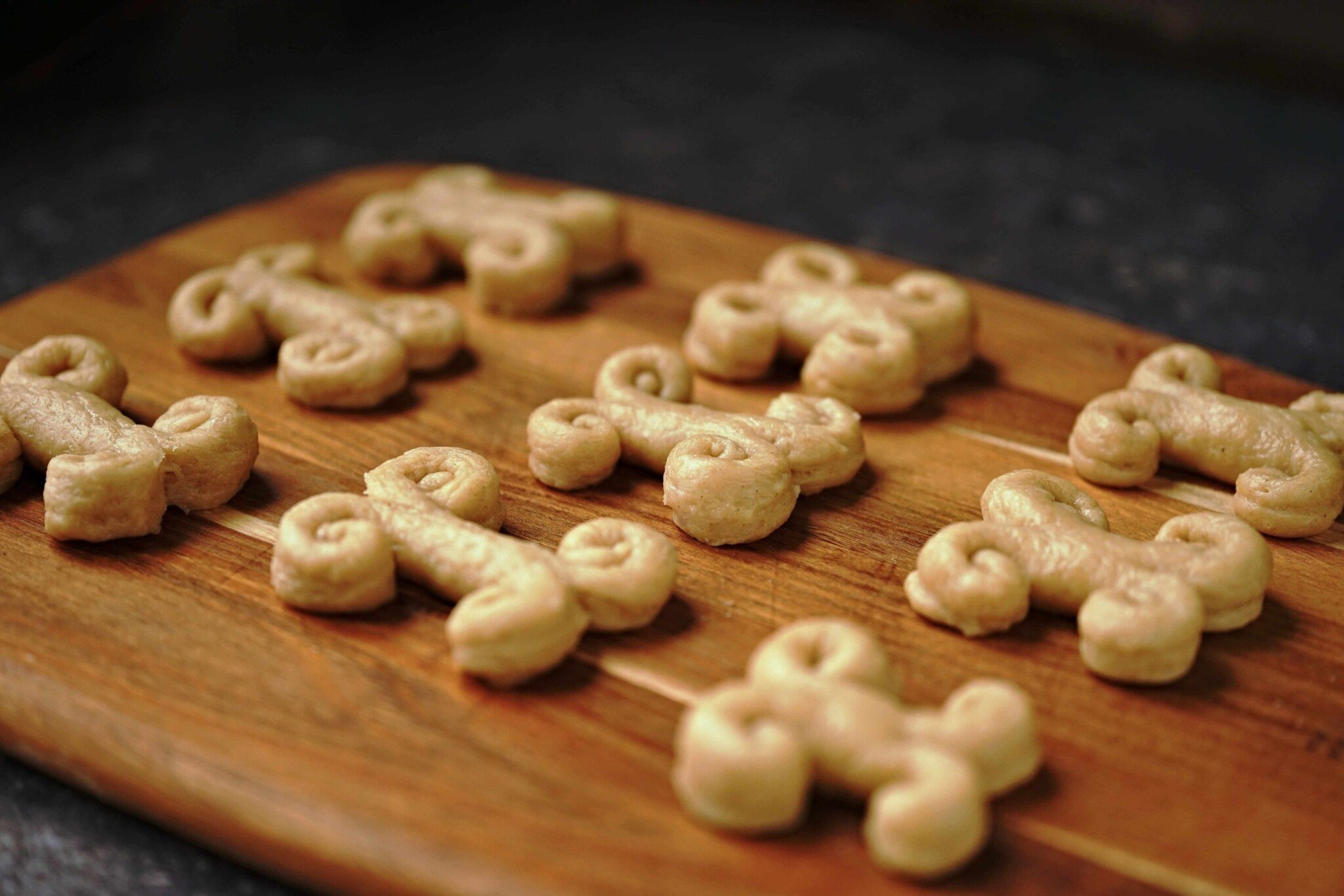 - To rozdělte na cca 12 stejných dílů, z každého rukama vytvarujte váleček, ten na obou koncích nakrojte a vytvořte tvar kosti.