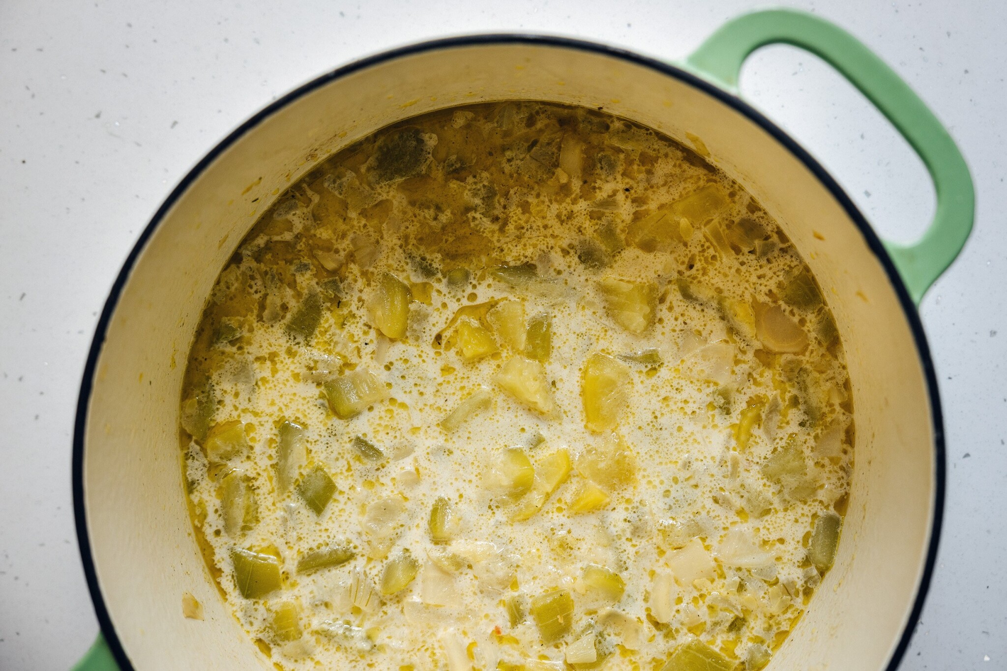 - Nahrubo pokrájenou cibuli nechte zesklovatět na rozpáleném másle, přidejte kostky oloupané cukety a petržele a opékejte dalších patnáct minut. To dodá omáčce chuť a vůni. Přidejte kostky brambor, vývar a sůl a vařte patnáct až dvacet minut doměkka.