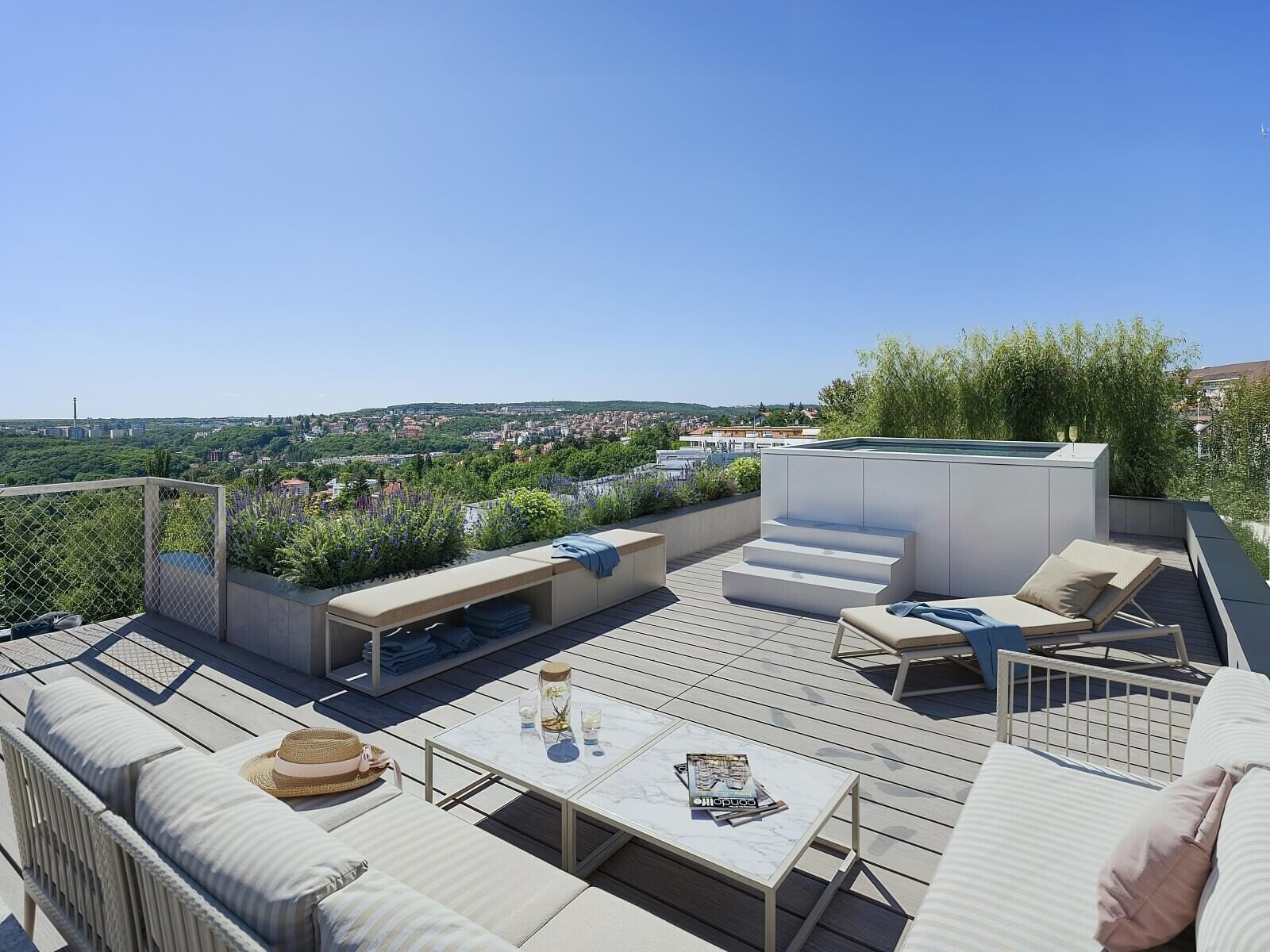 Mezi hlavní taháky pětipokojového bytu v prestižní lokalitě Na Hřebenkách rozhodně patří výhled a také ohromná střešní terasa s vířivkou. Kromě toho v bytě najdete interiér zařízený podle návrhu italského architekta Giovanniho Sacchiho. A také obývací pokoj s otevřenou kuchyní, jídelnou, vstupem na velký balkón a schodištěm na zmiňovanou terasu.