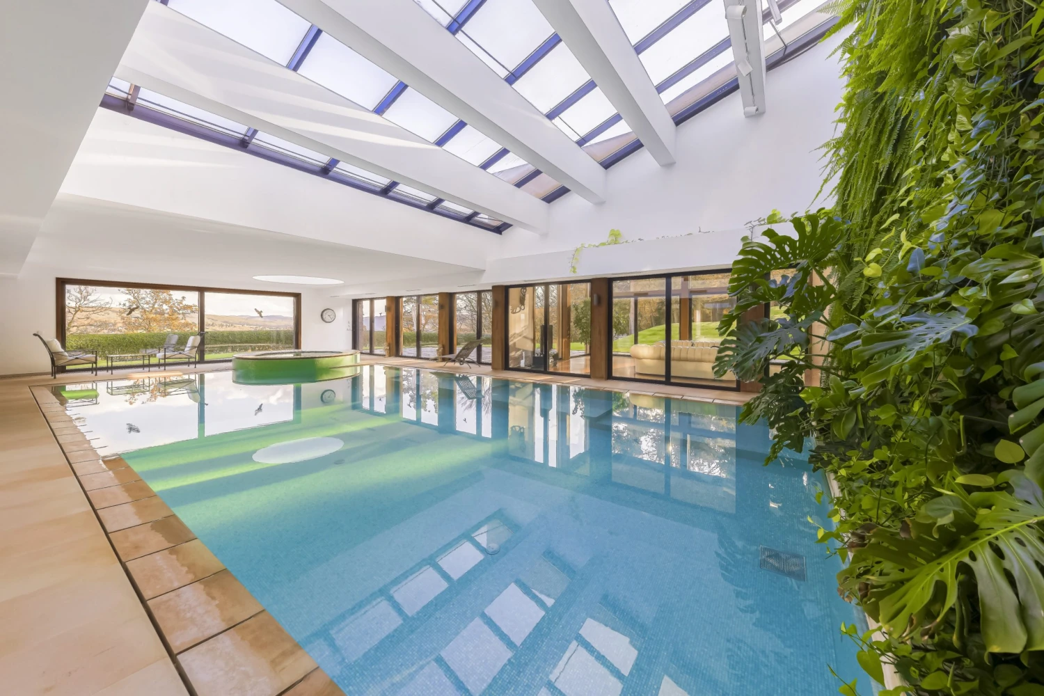 Dispozice a interiér hlavní dvoupodlažní vily zaujmou velkolepou vstupní halou s mimořádnou výškou stropu přes pět metrů a obývacím pokojem s krbem obloženým italským travertinem. Srdcem domu je mozaikový bazén o délce třinácti metrů, umístěný v centru vily, propojený s obývací částí a jídelnou, s přístupem ze všech přízemních prostor a přímým propojením na venkovní terasu.