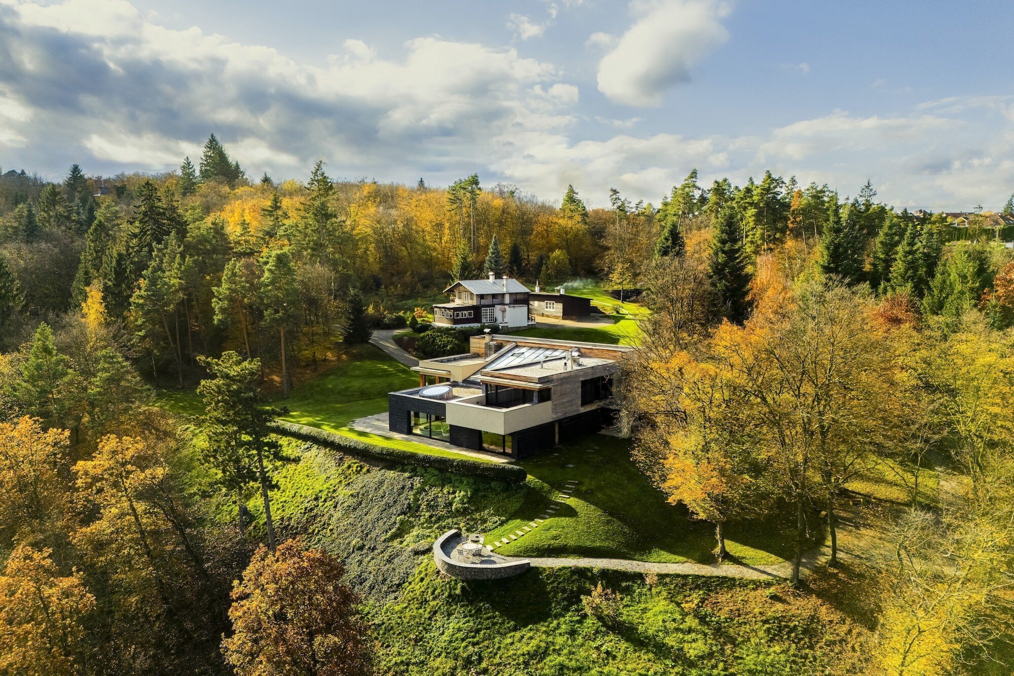 Jedinečná moderní vila s výhledem na údolí Vltavy je na prodej v Davli. A k ní navíc obrovský pozemek, na němž se nachází i rekonstruovaná historická chata pro hosty původně postavená pro Jana Masaryka, dále dům pro správce a tenisový kurt.