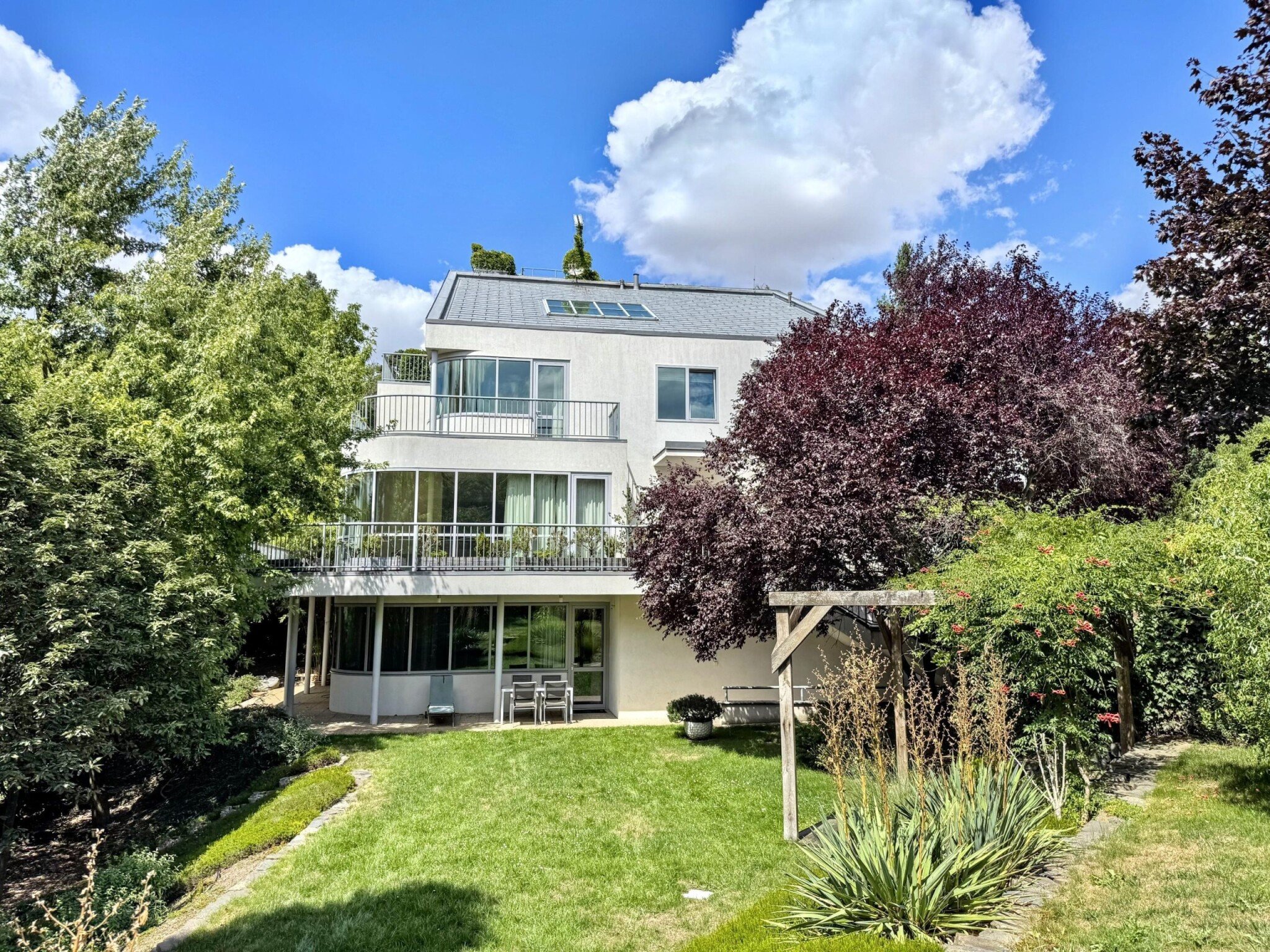 V srdci jedné z nejprestižnějších pražských čtvrtí stojí moderní vila, která spojuje funkcionalistické prvky, nadčasovou architekturu a soukromí. Dílo renomované architektky Zdenky Aulické nabízí čtyři podlaží propojená skleněným výtahem, wellness se saunou a fitness zázemím, krytý bazén s protiproudem i několik teras mezi vzrostlými stromy. Díky velkým proskleným plochám je v domě dostatek světla.