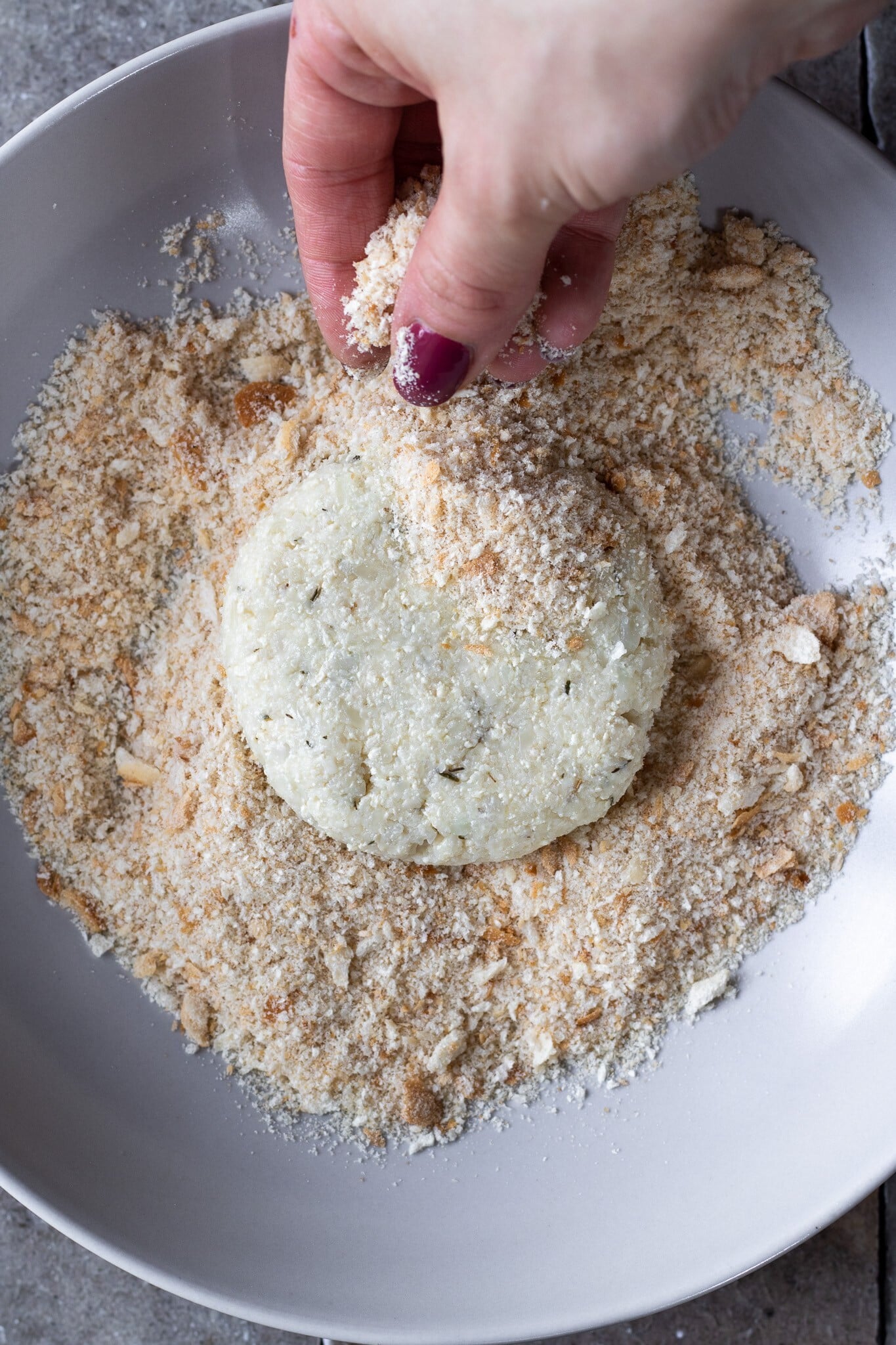 - Zchladlý květák rozsekejte v mixéru nadrobno. V míse smíchejte s nastrouhaným tofu, parmezánem, pečivem, tymiánem a solí. Nechte odležet 5 až 10 minut.