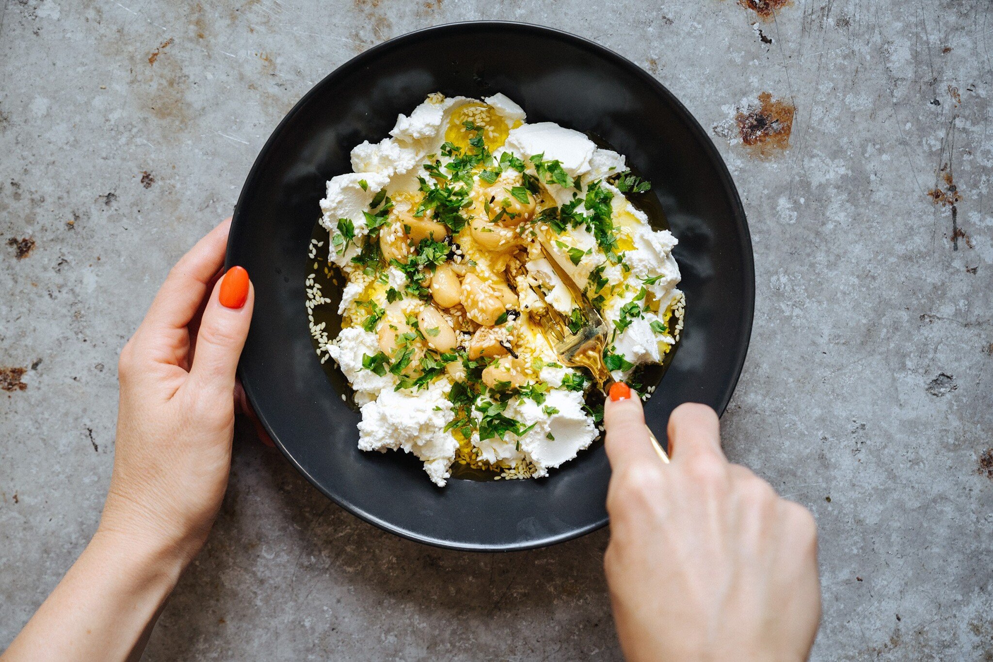 - Do misky dejte žervé, česnek se sezamem, nasekanou petržel či pažitku a sůl a vidličkou rozmačkejte na pomazánku, nemusí být zcela hladká. Dle potřeby zřeďte česnekovým olejem nebo dochuťte solí či citronovou šťávou.