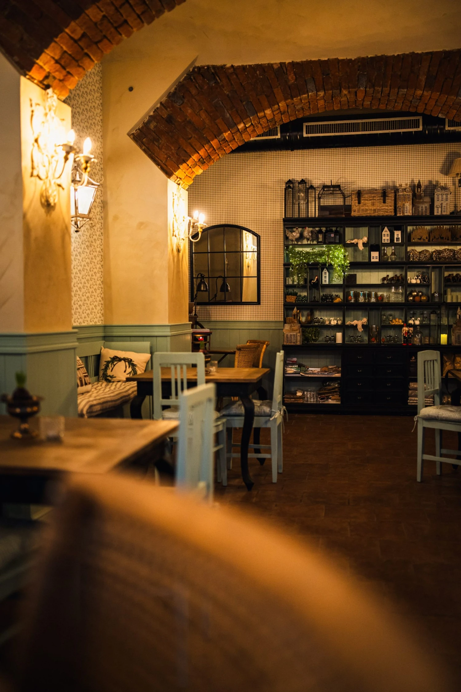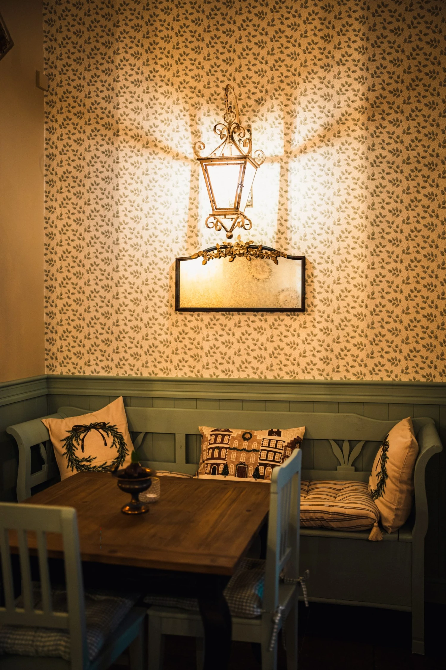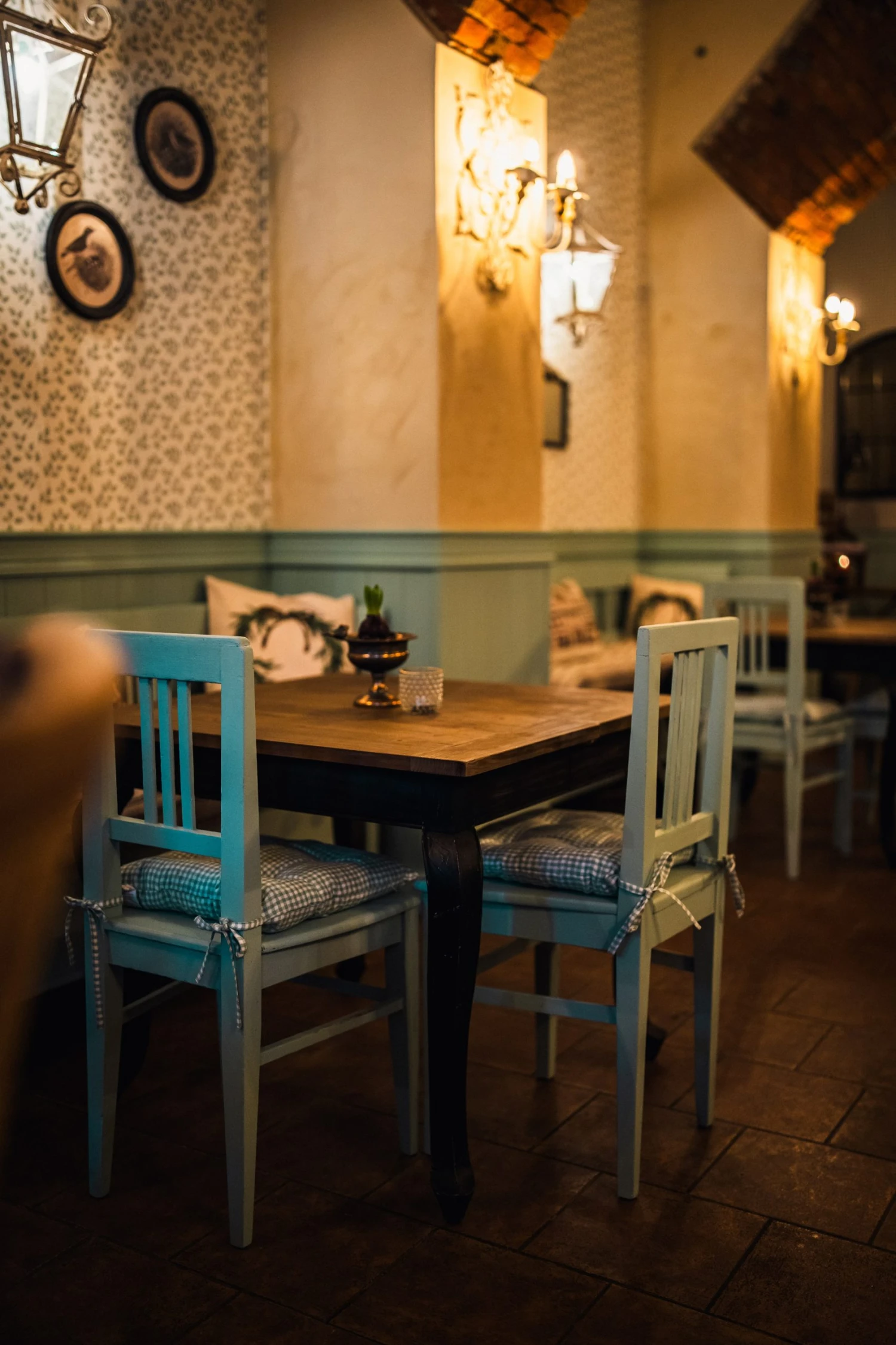 A brzy poznáte, že tohle není „jen další nový podnik“. Že na tomto místě se pracovalo s citem a že za ním stojí někdo s vkusem pro design i gastronomii. Vstoupíte do prostoru, kde se budete cítit jako u babičky nebo na anglickém venkově. Teplé světlo nástěnných lamp ve tvaru luceren se odráží od pískové omítky a tlumených zelených tónů, které se opakují na dřevěném obložení i židlích.