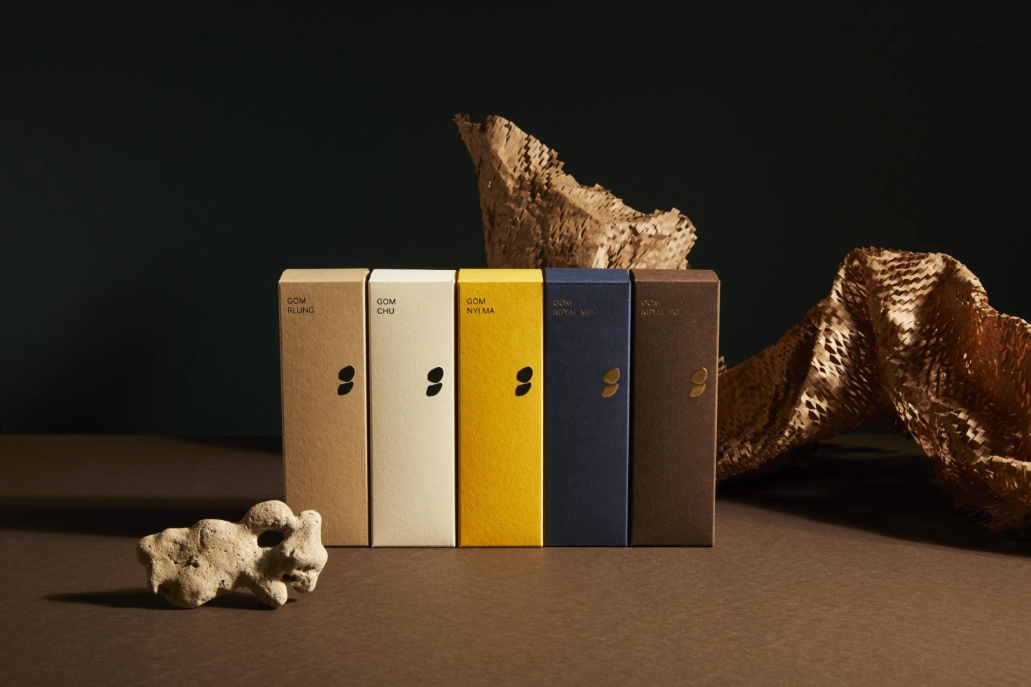 Ty se nyní prodávají pod názvy Rlung, Chu, Nyi Ma, Rgyal Mo a Rgyal Po, které stejně jako samotný název značky Gom vycházejí z tibetštiny. V překladu (ve stejném pořadí) znamenají Vzduch, Voda, Slunce, Královna a Král. Samotný název „Gom“ pak znamená „Meditace“. Název značky Salákovou napadl při čtení knihy buddhistického učitele Mingyur Rinpočheho.