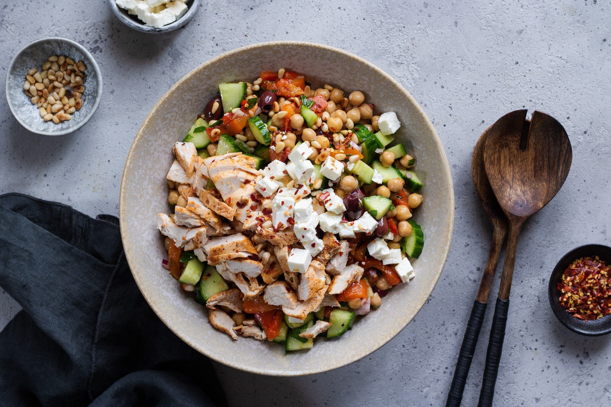 Cizrnový salát s pečenou paprikou, sýrem feta, olivami a pečeným kuřetem