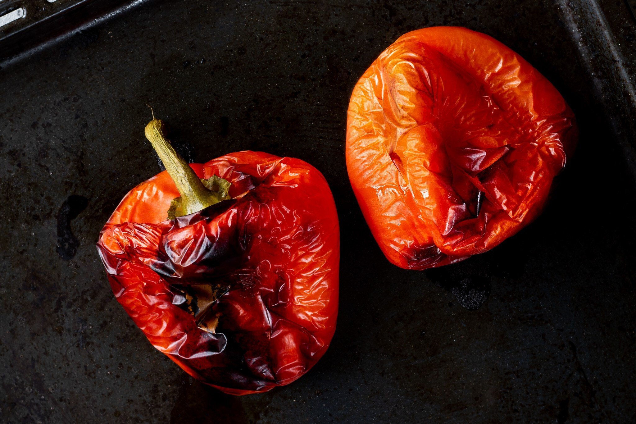 - Papriky položte na plech a v troubě pečte při 210 °C 35 až 40 minut, dokud se na nich neobjeví černé puchýře. Po upečení je opatrně přendejte do mikrotenového sáčku a uzavřete nebo vložte do mísy a překryjte fólií. Papriky se zapaří a půjdou snadno oloupat. Nechte chladnout asi půl hodiny.