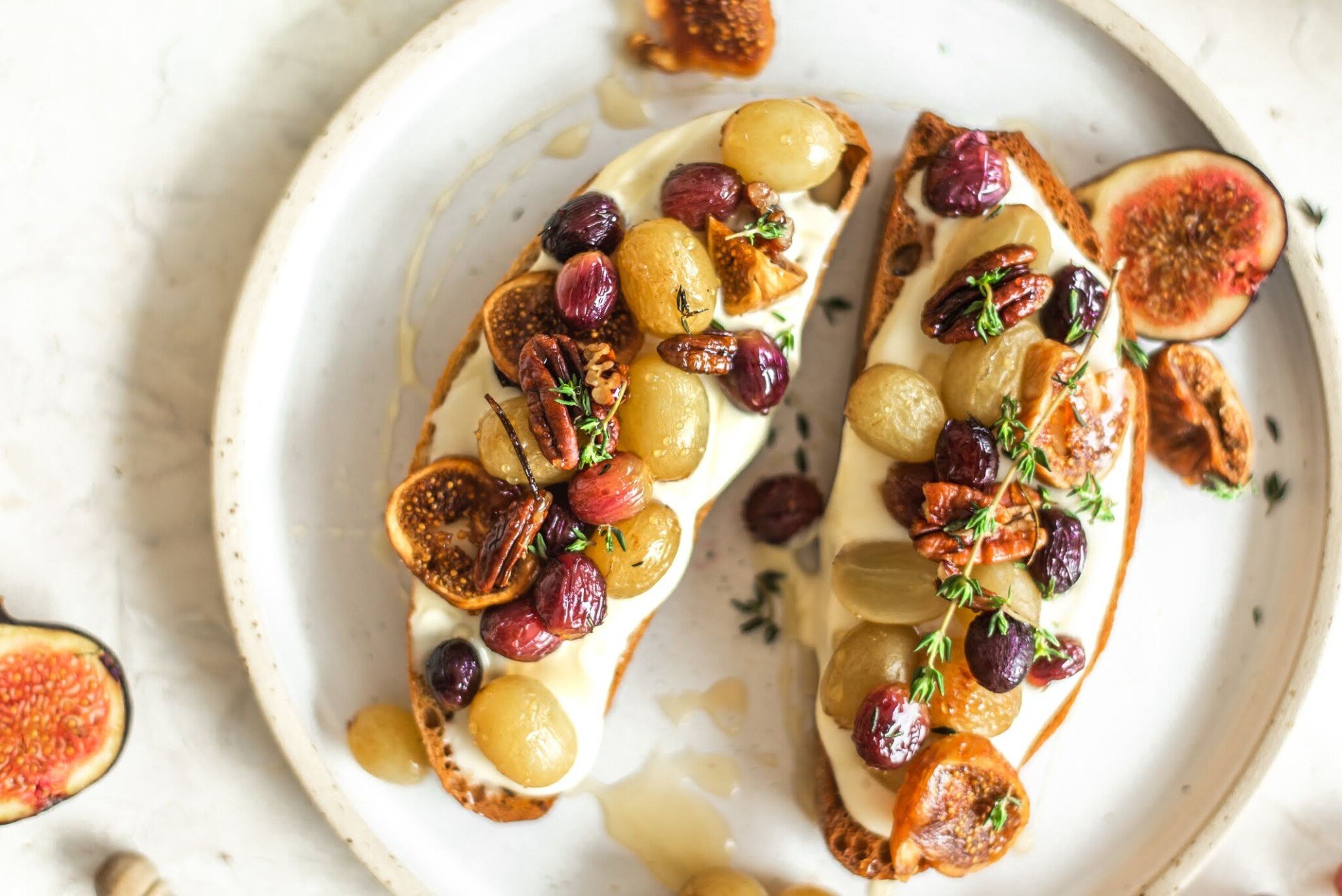 Topinka se šlehaným sýrem brie, pečenými hrozny a ořechy