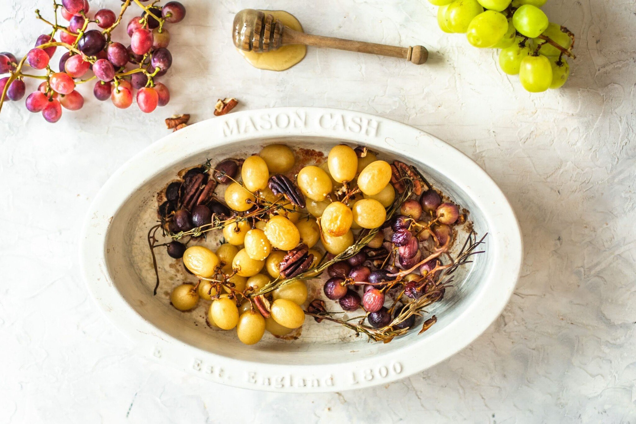 - Předehřejte troubu na 185 °C. Hrozny omyjte a vložte do pekáče spolu s bylinkami a ořechy. Zakápněte olivovým olejem, přidejte sůl a pečte přibližně 20 minut, nebo dokud hrozny nezezlátnou a nezačnou lehce praskat.