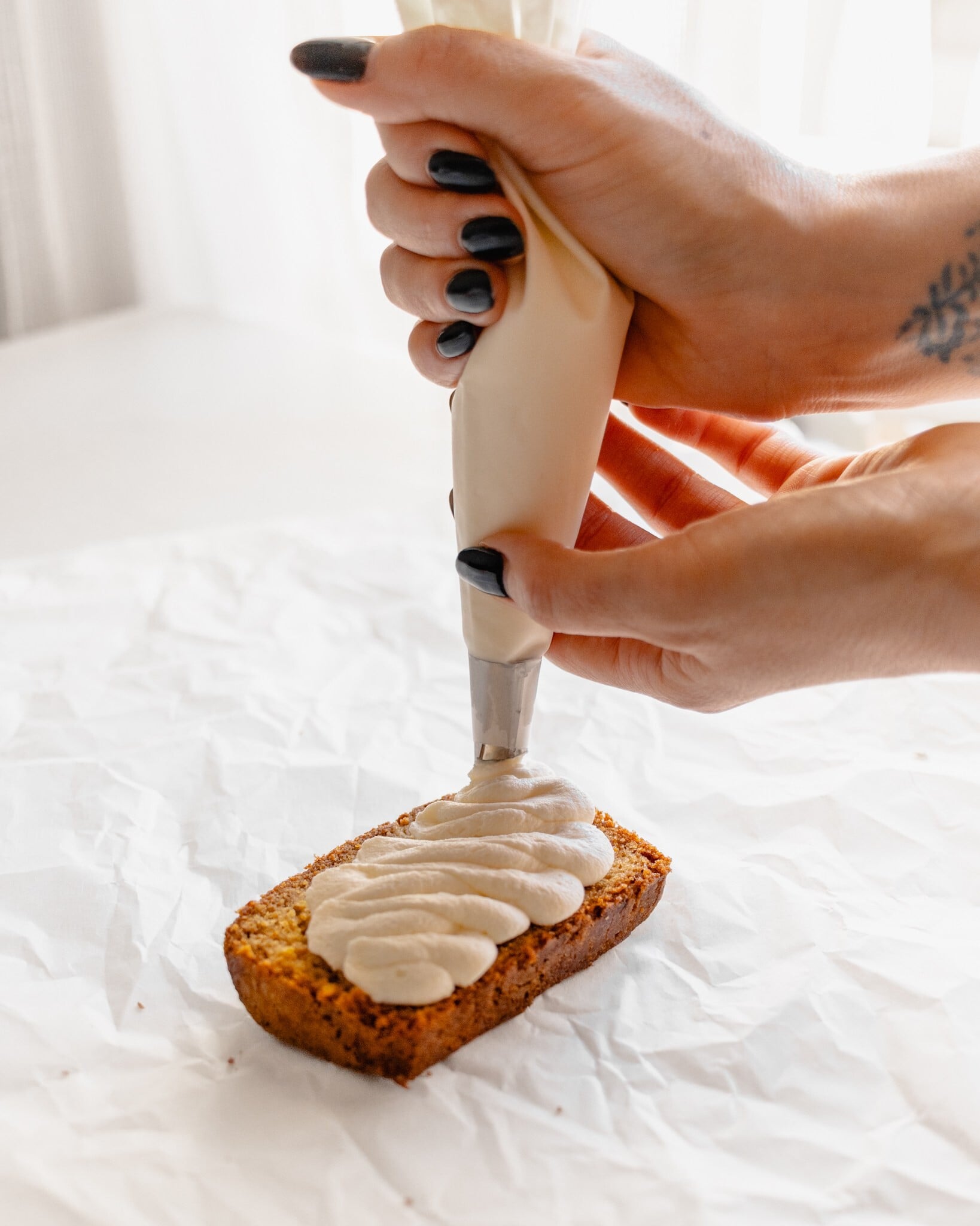 - Smetanu vyšlehejte téměř do tuha, přidejte mascarpone s medem a ještě chvíli šlehejte do pevného krému. Na plátky chlebíčku ho nanášejte ideálně až těsně před podáváním, aby nenavlhl, případně ozdobené porce uložte na chvíli do lednice. Krém natřete jen tak rustikálně lžící nebo si pomozte cukrářským sáčkem s hladkou zdobicí špičkou.