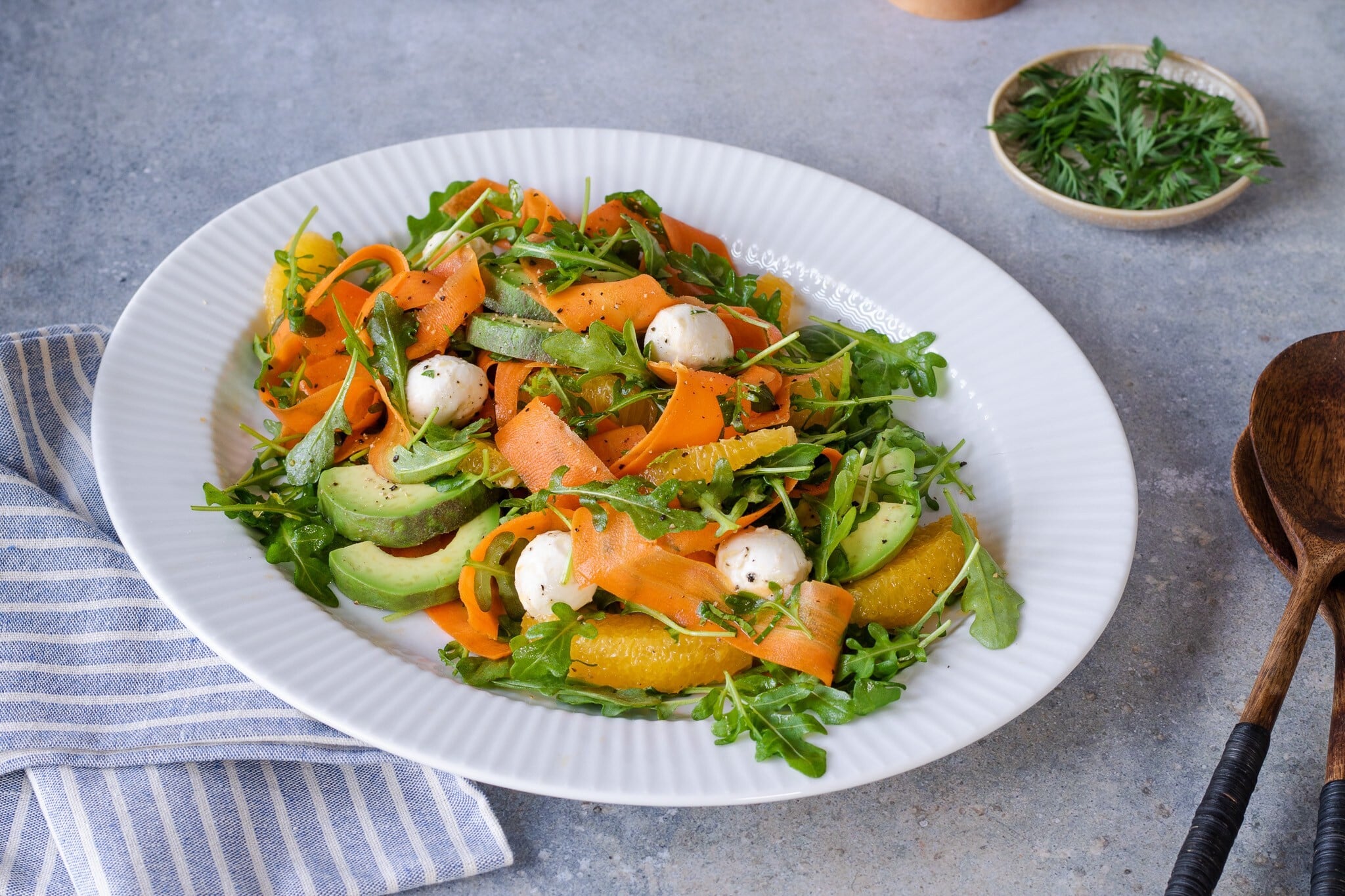 Mrkvový salát s avokádem, sýrem a pomerančem