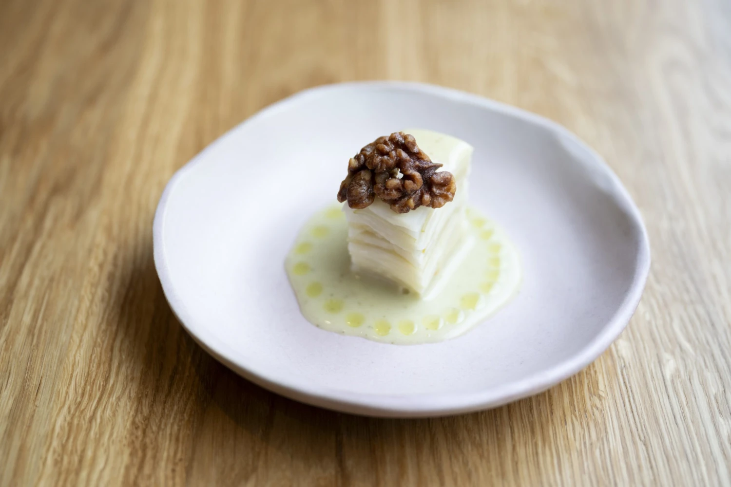 Krásnou variantou je i interpretace klasického Waldorf salátu. V Ódě ve vrstvách kladený celer vařený v česnekové smetaně, jablko naložené v celerovém octu a kedlubna. K tomu olej z řapíkatého celeru a dokonale opražený vlašský ořech.