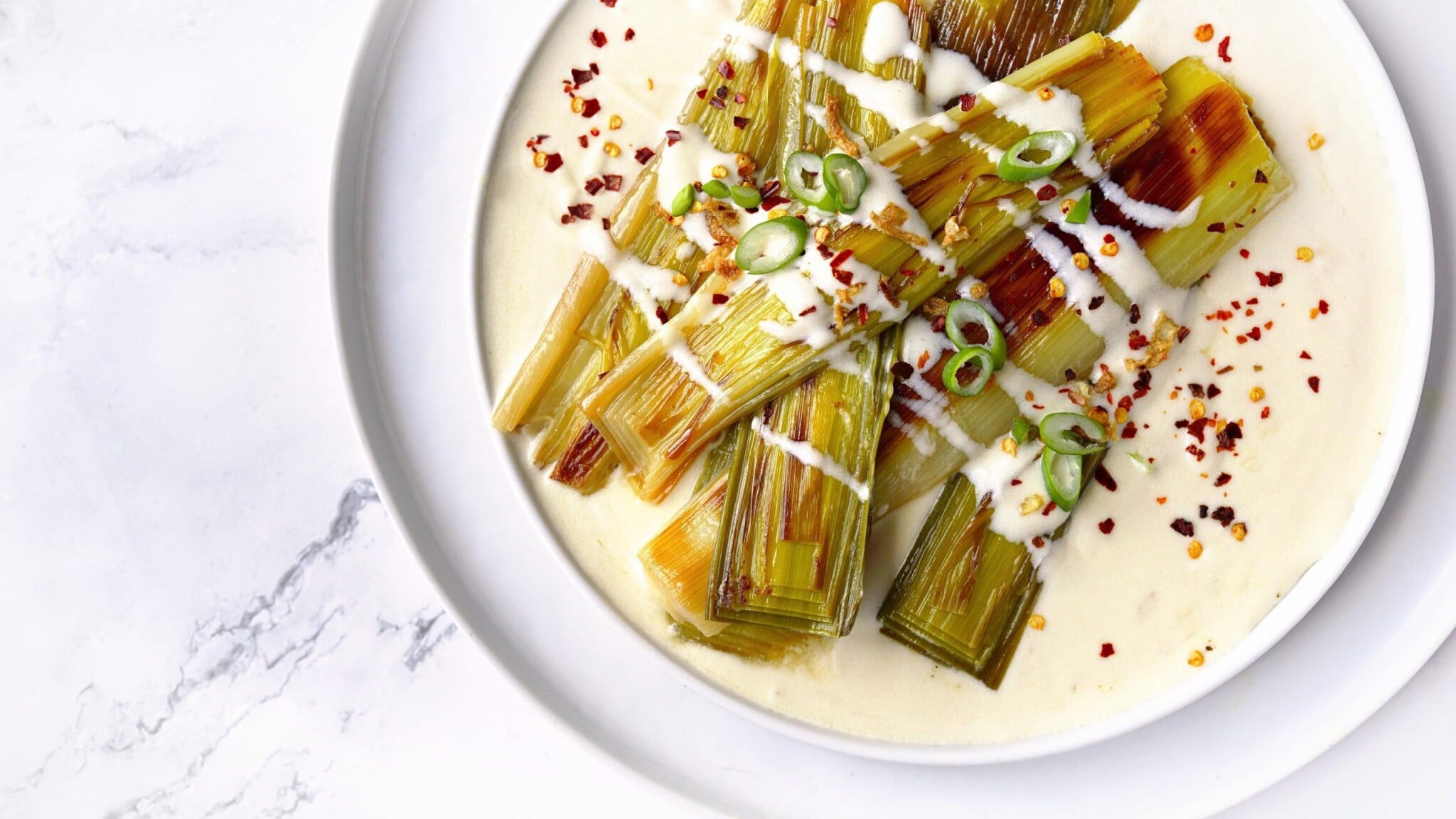 - Dušený pórek podávejte s teplou omáčkou beurre blanc, posypaný sušeným chilli, čerstvým pepřem a nasekanou jarní cibulkou nebo pažitkou.