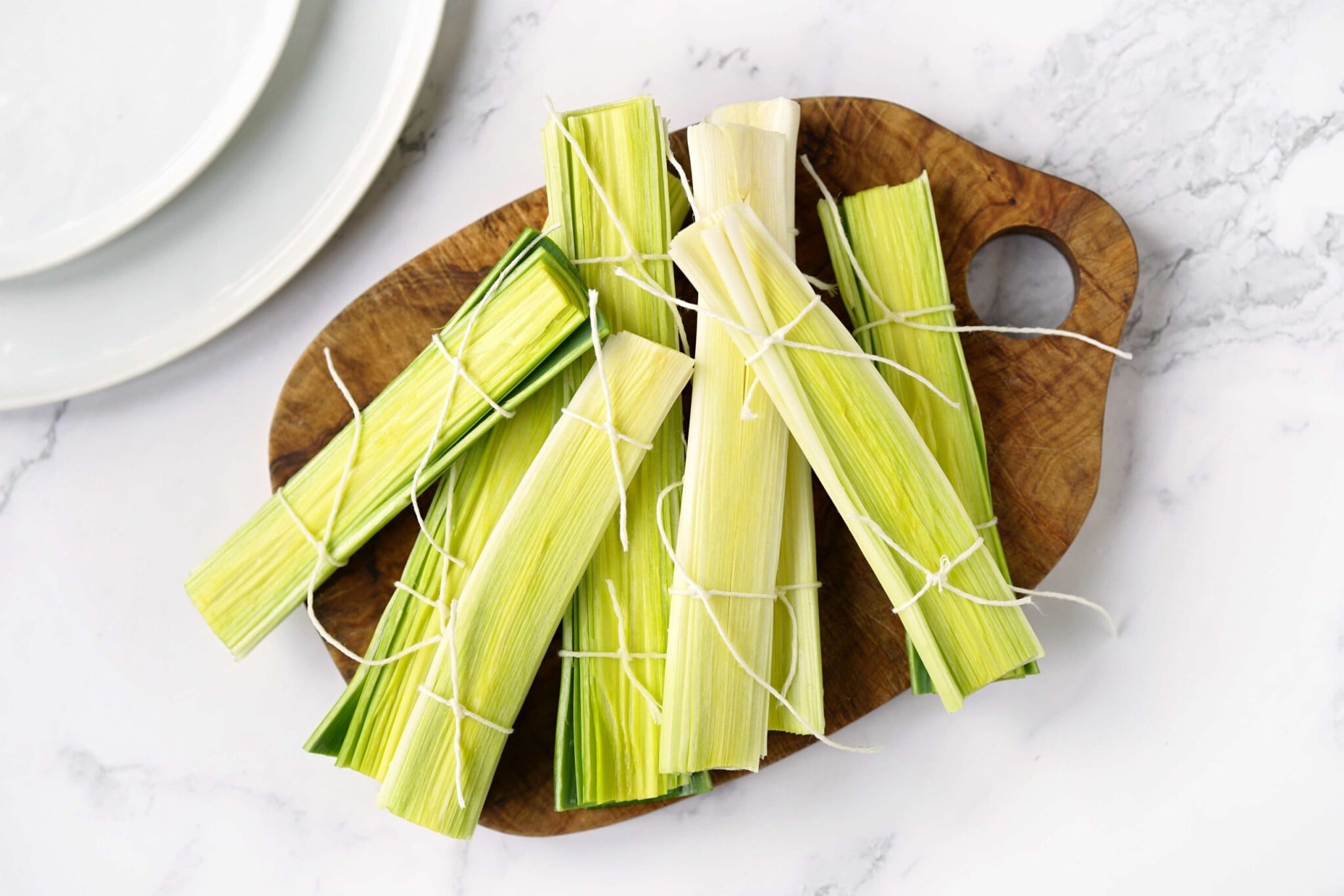 - Předehřejte troubu na 190 °C. Pórky překrojte napůl a každou část podélně rozkrojte. Takto připravené kousky svažte gastro provázkem, aby se nerozpadly.