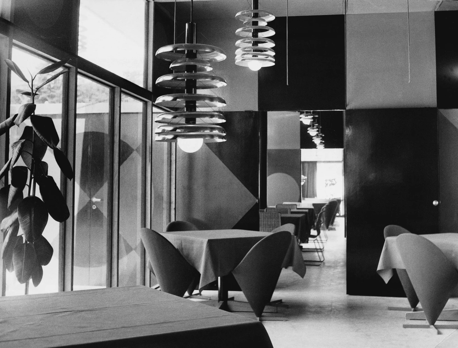 Nová podoba restaurace je zajímavá nejen díky řešení samotné dispozice: pro velkou centrální místnost Verner Panton vymyslel flexibilní systém z látek s geometrickými vzory, které visí ze stropu a rozdělovaly místnost na menší části. Vyniká ale také díky originálnímu použití barev.
