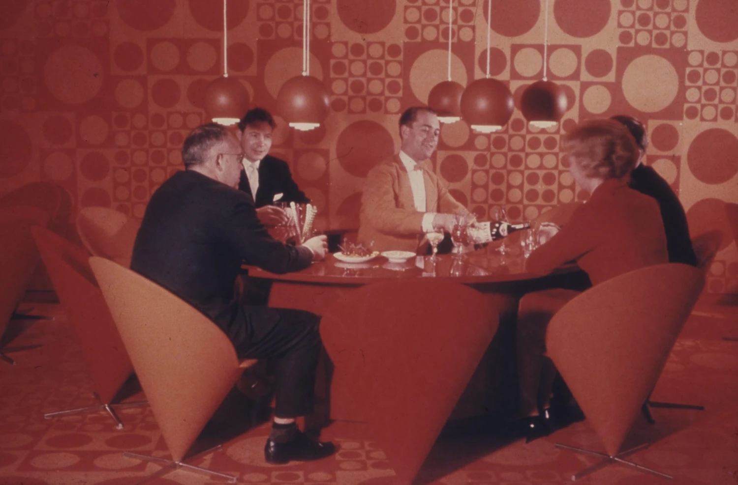 Těžko říct, zda i tento faktor stojí za úspěchem červeně čalouněné kuželové židle s vysokou opěrkou, kterou designér, jež na začátku kariéry pracoval pro legendu dánského designu Arne Jacobsena, speciálně pro interiér navrhl. Z dobových fotografií je však patrné, že jde o jednu z nepřehlédnutelných dominant prostoru.