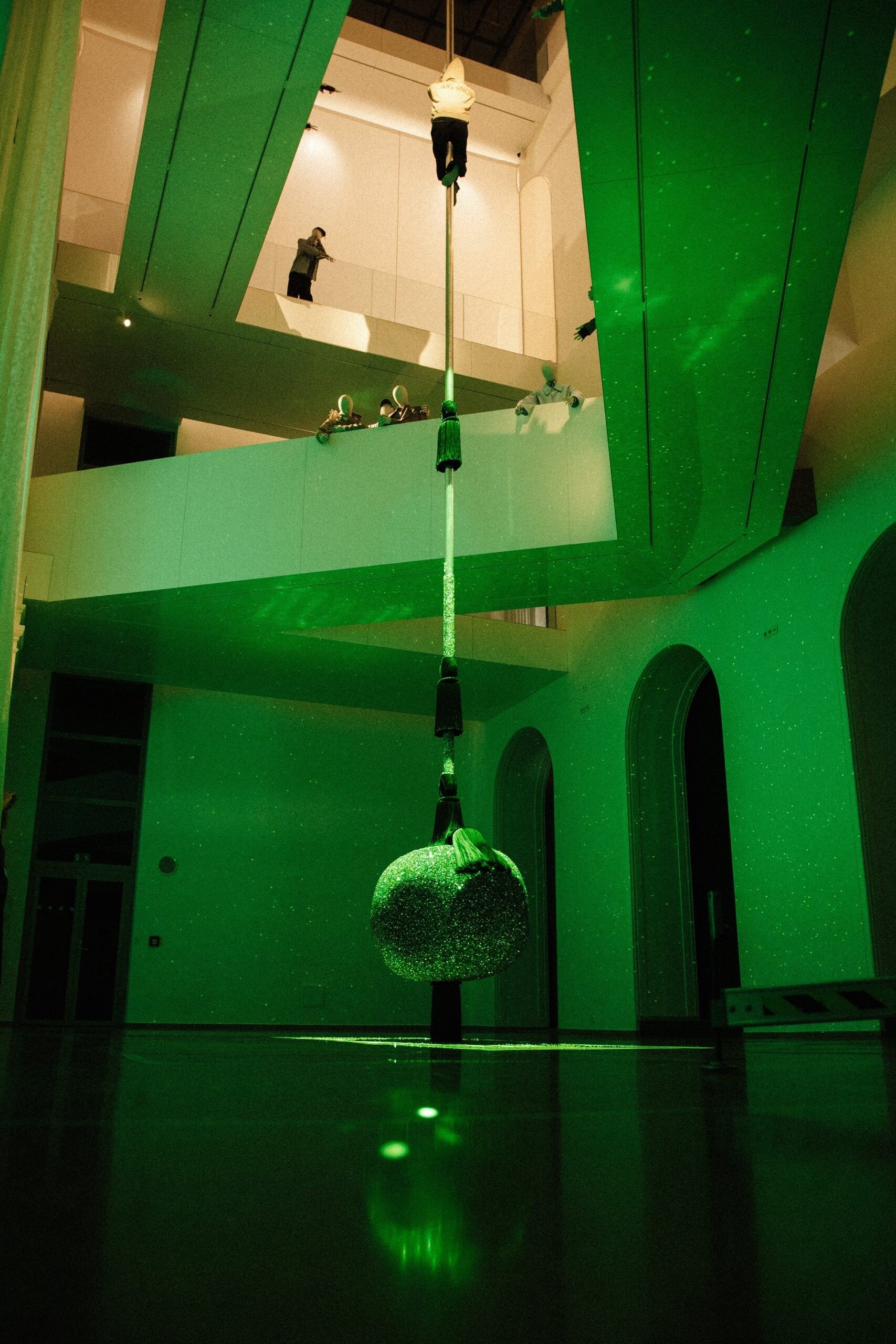 Pomalu kmitá ze strany na stranu a jeho elipsoidní, v průměru metr a půl širokou kouli pokrývá celkem šedesát kilogramů zelených krystalů Preciosa. Ty díky dvěma silným reflektorům, jež jsou na ně namířené, vrhají třpytivé odlesky do prostoru.
