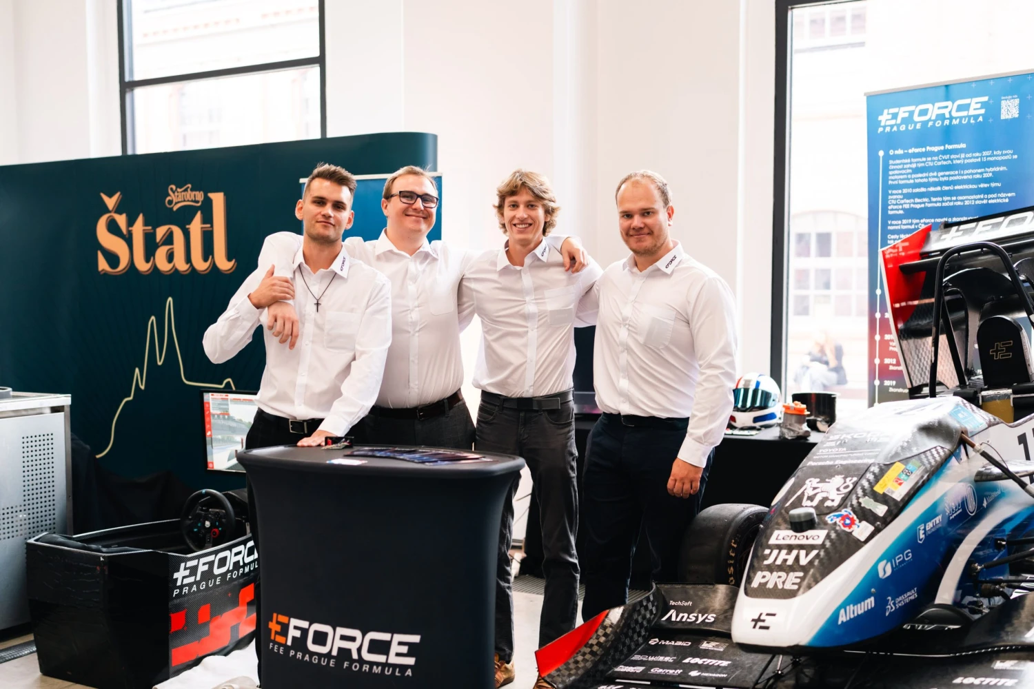 Studenti ČVUT z týmu eForce představili závodní elektroformuli a doplnili ji virtuálním simulátorem, na kterém si návštěvníci mohli vyzkoušet rychlou jízdu na okruhu.