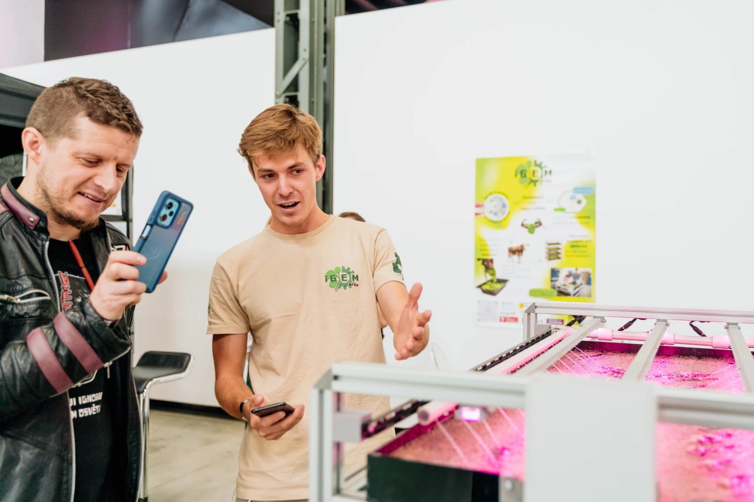 Tým iGEM Brno předvedl, jak může vypadat budoucnost výroby proteinu prostřednictvím nejrychleji rostoucí rostliny světa – duckweed, kterou si návštěvníci mohli prohlédnout pod mikroskopem v jejich autonomním vertikálním systému.