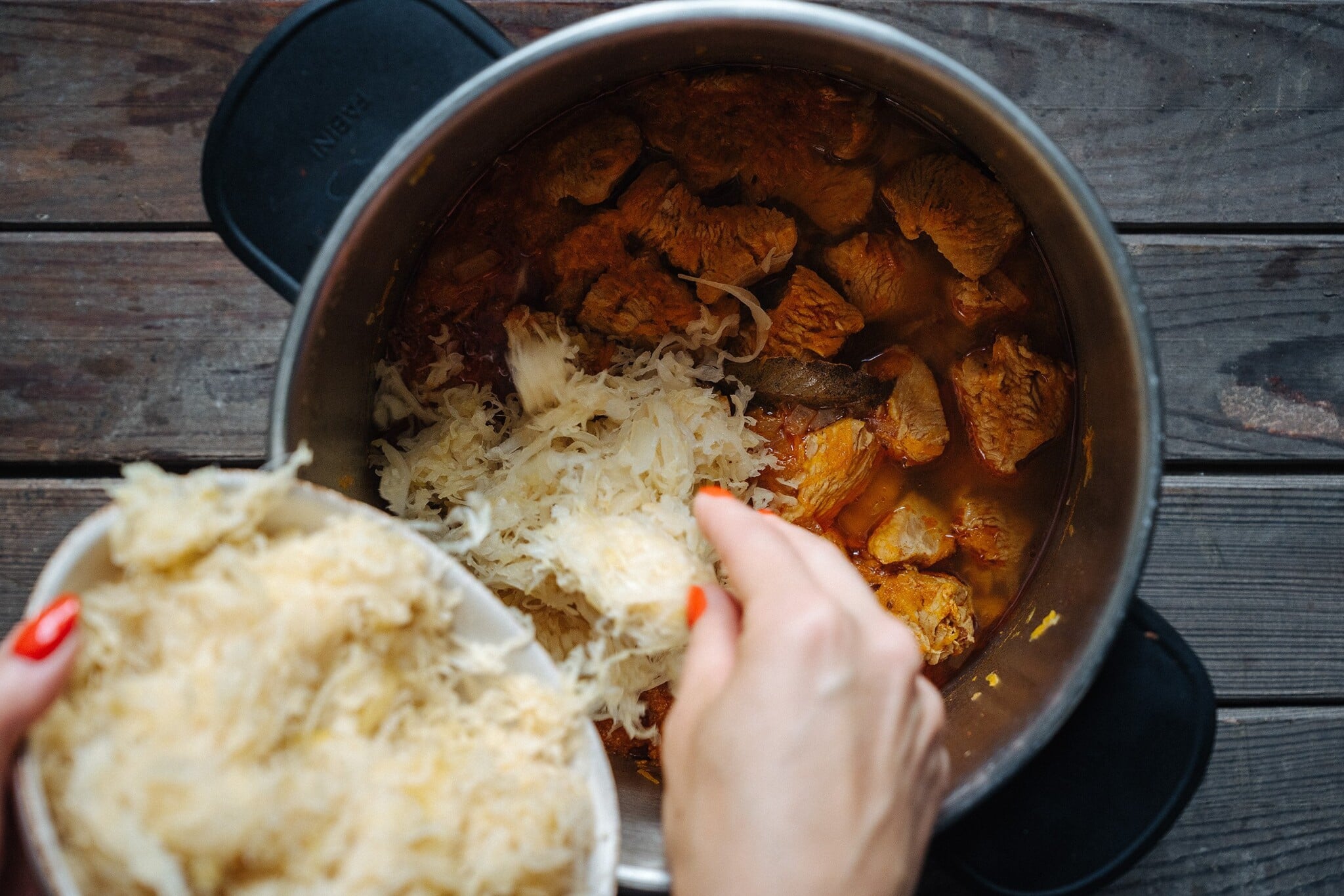 - Zasypejte paprikou a kmínem (ten slouží na chuť i proti nadýmání), jen pár vteřin společně opékejte, aby se paprika rozvoněla, ale nezhořkla, a ihned zalijte vodou či vývarem. Tekutiny dejte jen tolik, aby z masa cca třetina vyčuhovala. Přidejte bobkový list, osolte a opepřete a pod poklicí duste 45 až 60 minut doměkka podle typu masa. Já si pomohla tlakovým hrncem, takže se maso za 20 minut úplně rozpadalo. V klasickém hrnci čas od času zamíchejte a zkontrolujte, jestli není třeba přidat tekutinu.