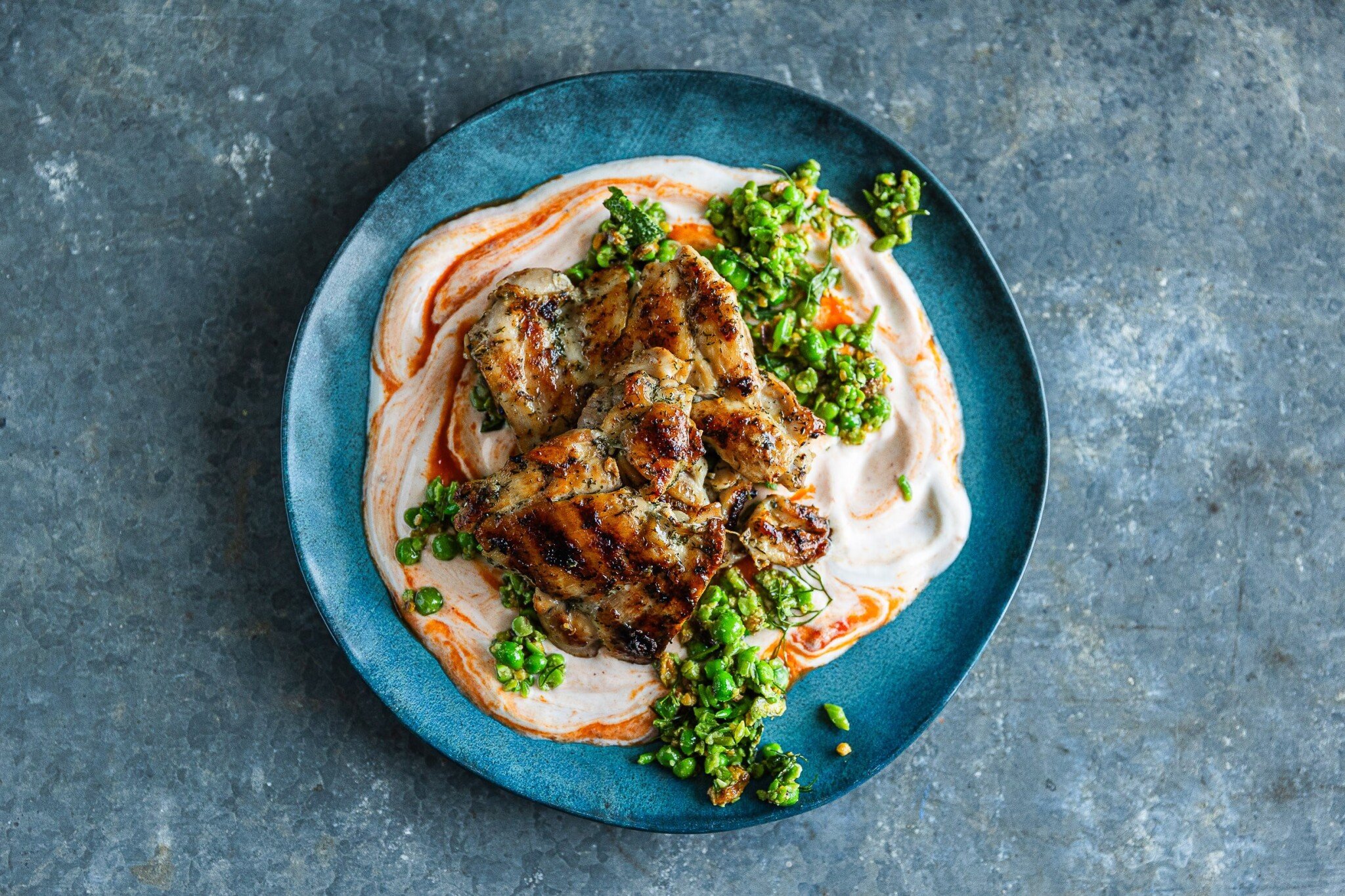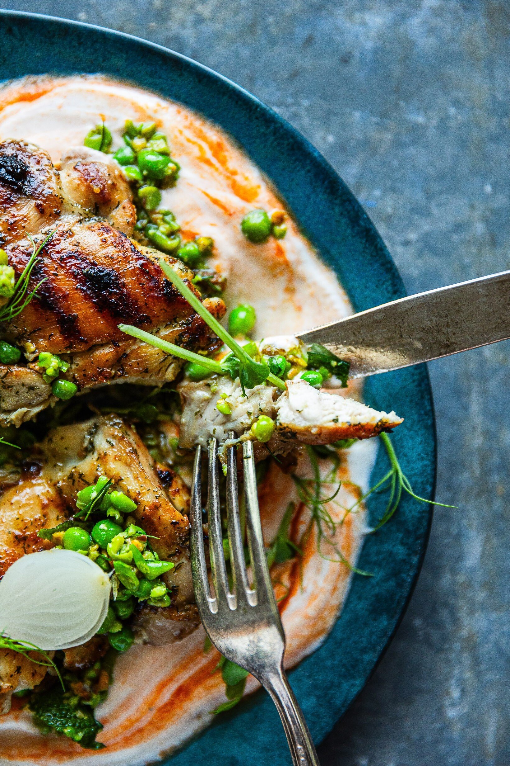 Grilované kuřecí stehenní řízky, hrášková gremolata a jogurtová harissa