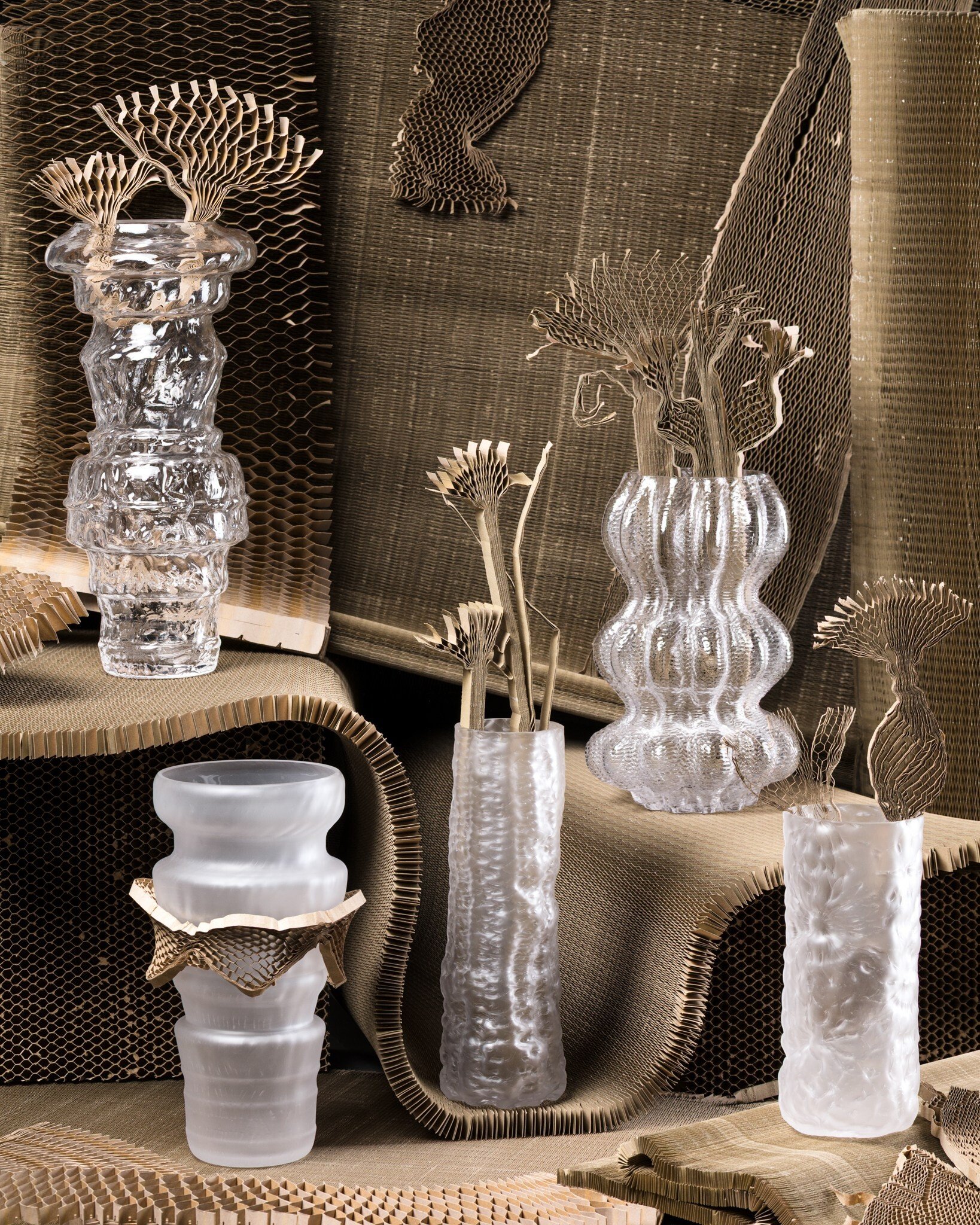 „Soustředila jsem se na zásadní vlastnost papírových forem: jejich postupné prohořívání a úplné shoření. U voštin mě pak zajímalo, kolik různorodých dekorů lze z jediné konstrukce materiálu získat,“ vysvětluje tvůrkyně.
