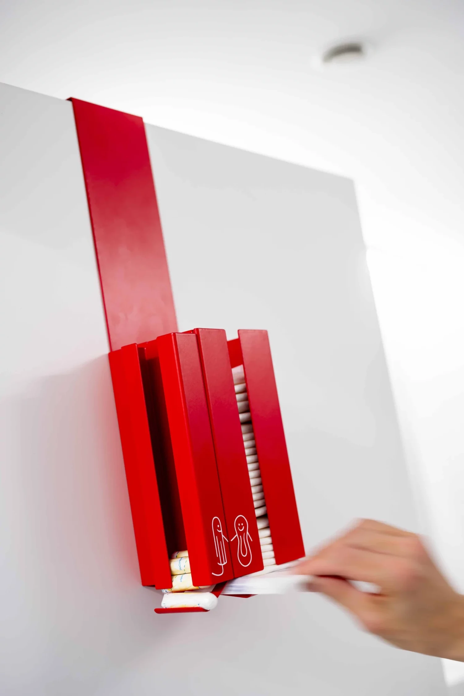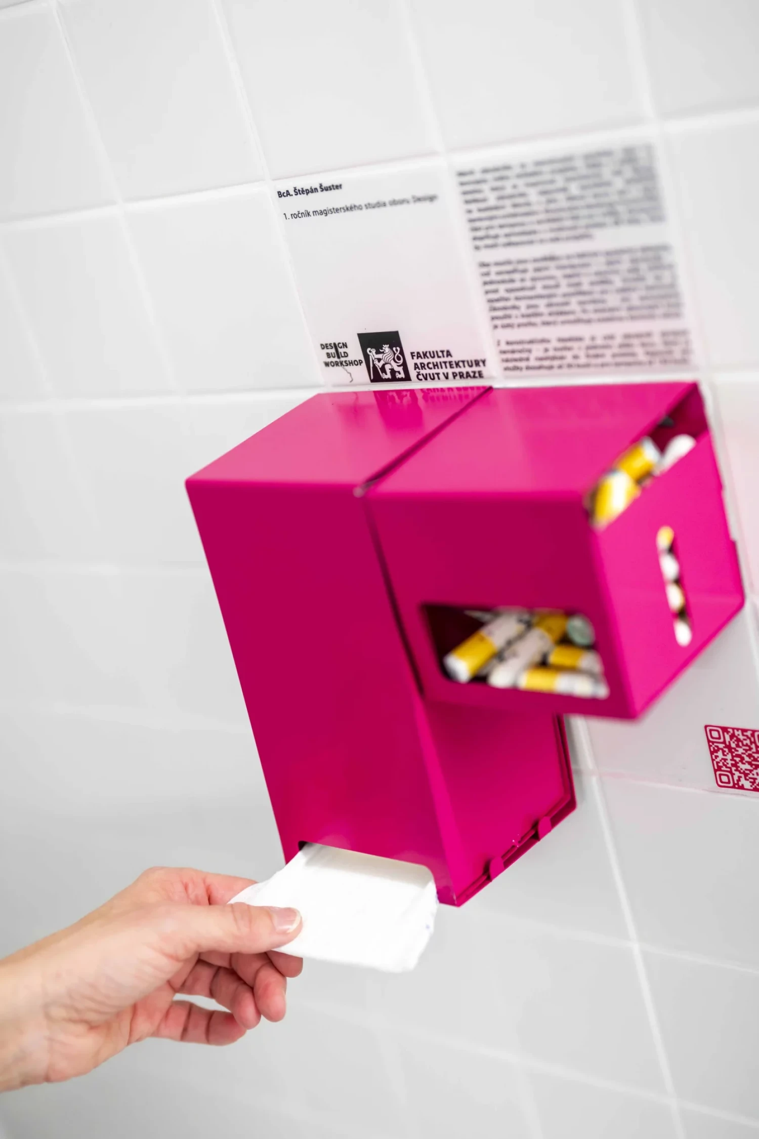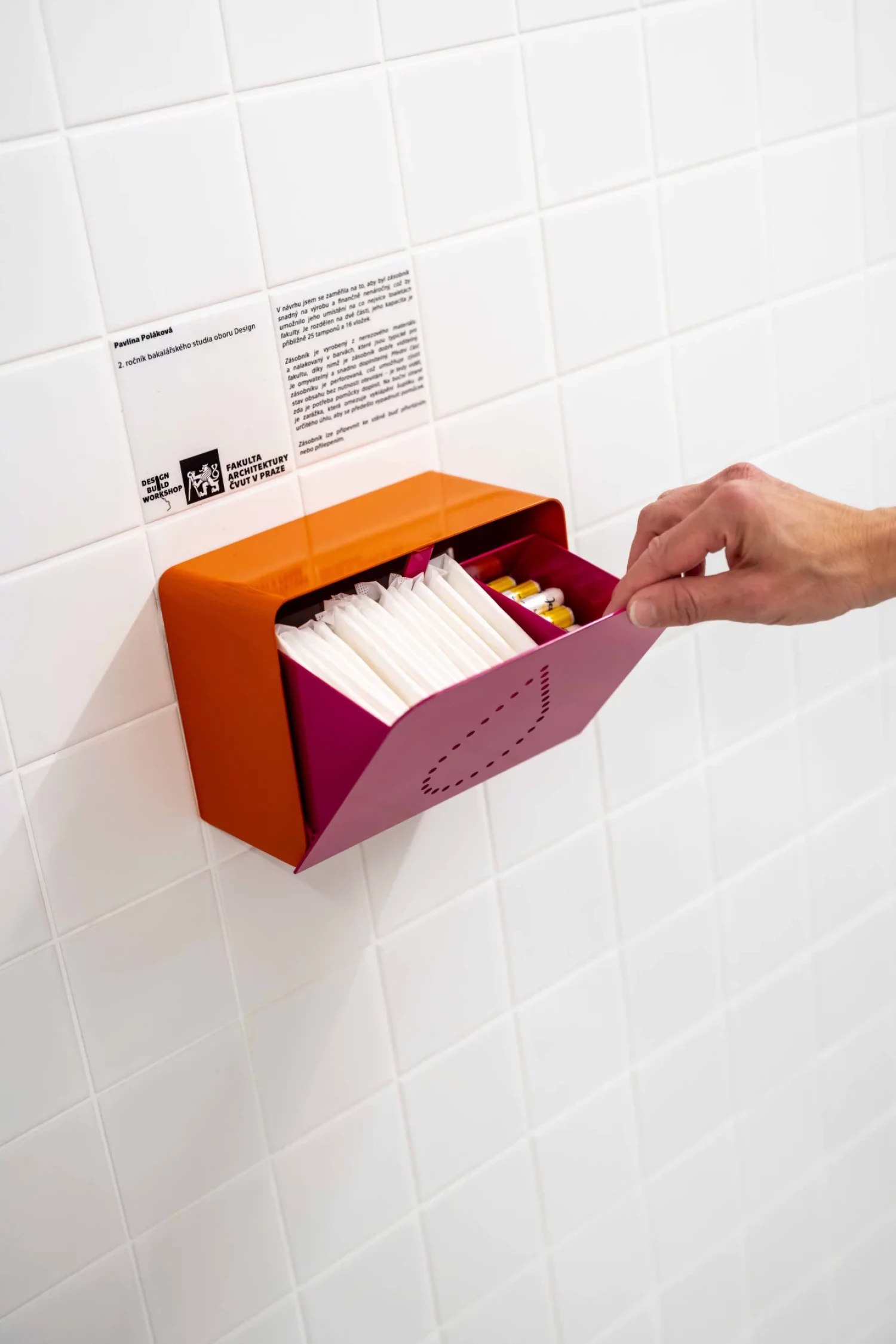 Své zásobníky na menstruační pomůcky tu prezentuje studentka Pavlína Poláková, Štěpán Šuster a Tereza Cvrčková. Každý k jejich podobě přistoupil jinak, jeden zvolil závěsnou variantu zásobníku na dveře, další dva takové, které se přidělají na stěnu záchodků.