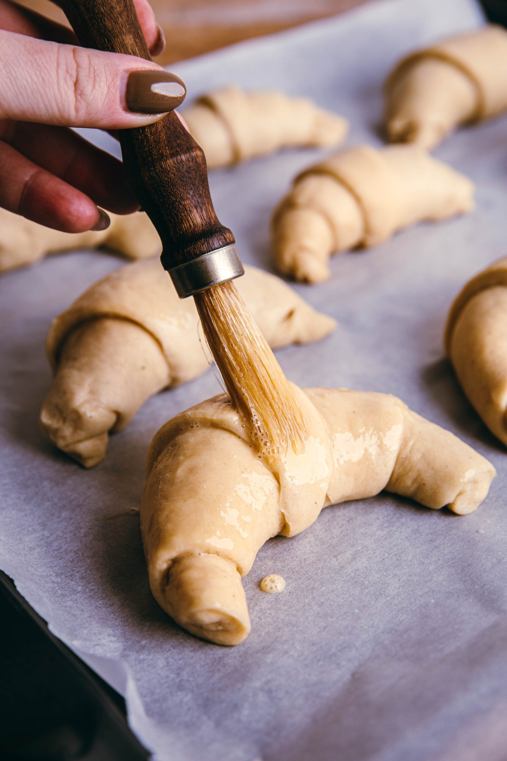 - Dva plechy vystelte pečicím papírem a troubu předehřejte na 190 °C. Rohlíčky s odstupy rozprostřete na připravené plechy a nechte ještě 20 minut vykynout. Potřete prošlehaným vajíčkem a vložte do rozpálené trouby na 10 až 15 minut, rohlíčky by měly lehce zezlátnout.