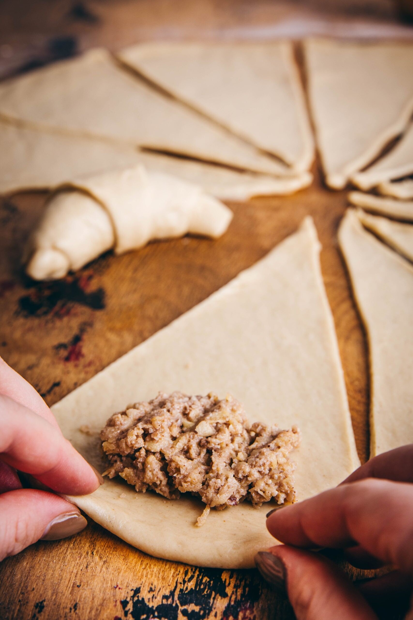 - Po hodině by těsto mělo zdvojnásobit svůj objem, být krásně nafouklé, vypouklé a plné bublin, pokud ještě není, nechte ho kynout dalších 20 minut. Vykynuté těsto na lehce pomoučněném povrchu párkrát prohněťte, poté válečkem vyválejte na co největší tenké kolo. Kolo rozkrájejte na 12 stejných trojúhelníků. Nejširší vnější část každého trojúhelníku poklaďte lžící vychladlé náplně. Trojúhelníčky zatočte do rohlíčků, jeho konec přimáčkněte k těstu, aby se v troubě nerozjely. Lehce zahněte do tvaru rohlíčků.