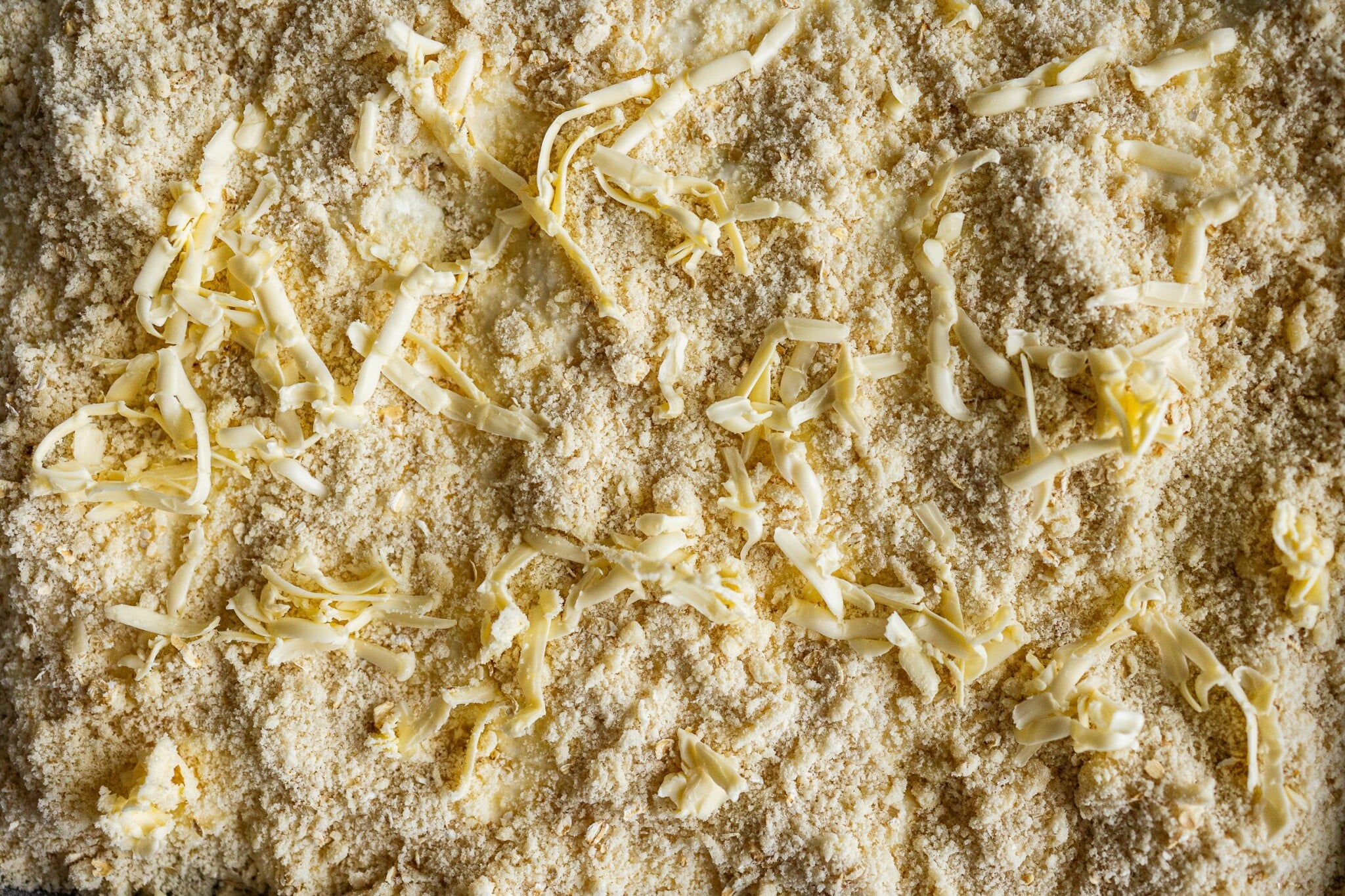 - V míse smíchejte mouku, vločky, cukr, prášek do pečiva, citronovou kůru a špetku soli. Přistrouhejte 120 gramů studeného másla a konečky prstů vypracujte hrubou drobenku.