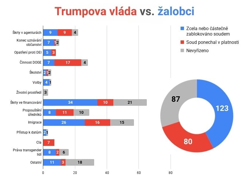 „Nesledujeme případy, ve kterých je Trumpova administrativa žalobcem, ani občanskoprávní spory,“ upozorňují její autoři. Jendo se však zdá být jasné. Soudy vedené proti opatřením druhé Trumpovy vlády zatím dávají za pravdu spíš žalobcům.