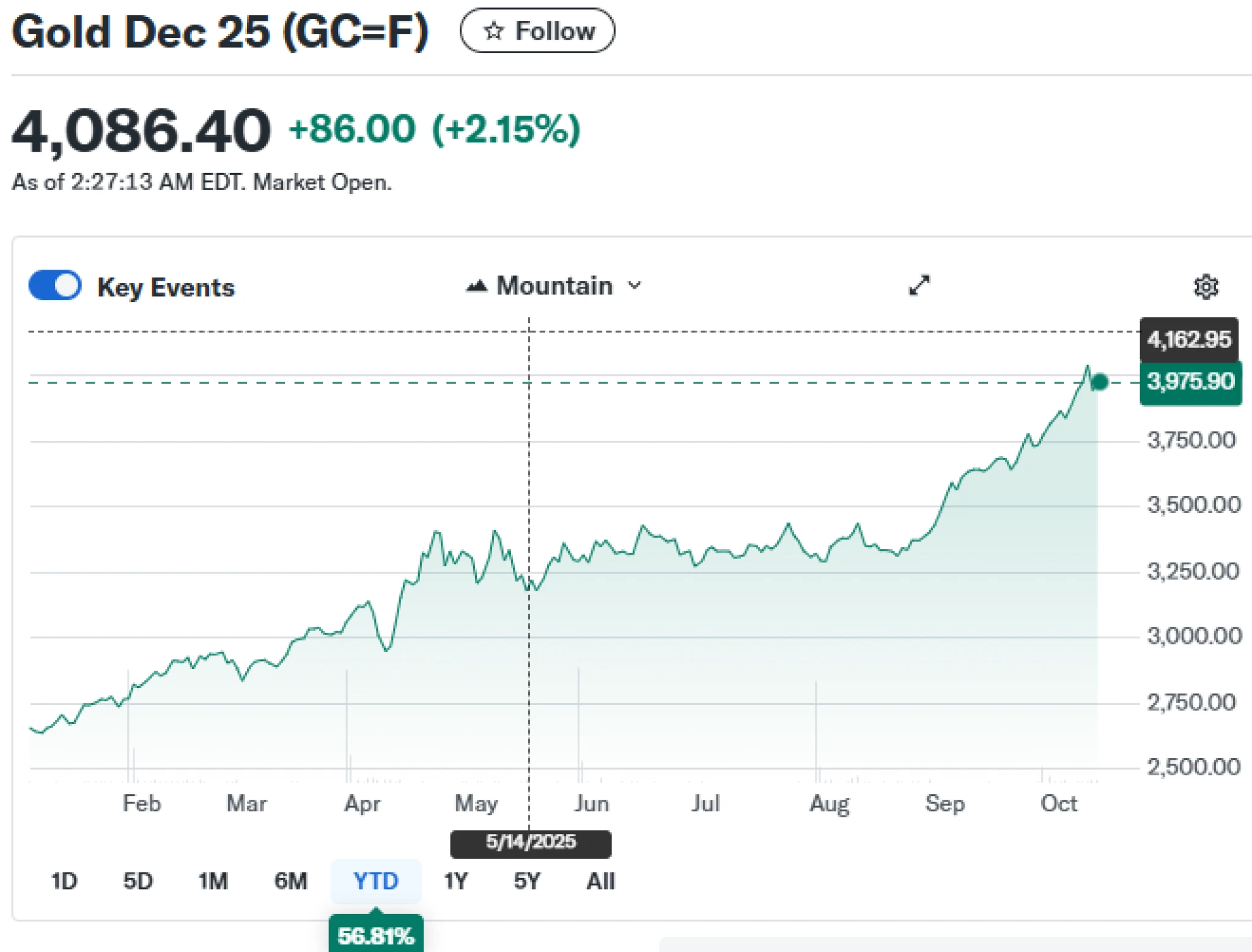 Cena zlata k okamžitému dodání dnes vystoupala na rekordních 4086,40 dolaru (asi 85 473 korun) za troyskou unci (oz; 31,1 gramu). Informovala o tom agentura Reuters. Následně na další rekord vystoupala i cena stříbra, které se obchodovalo za 51,38 dolarů za oz.